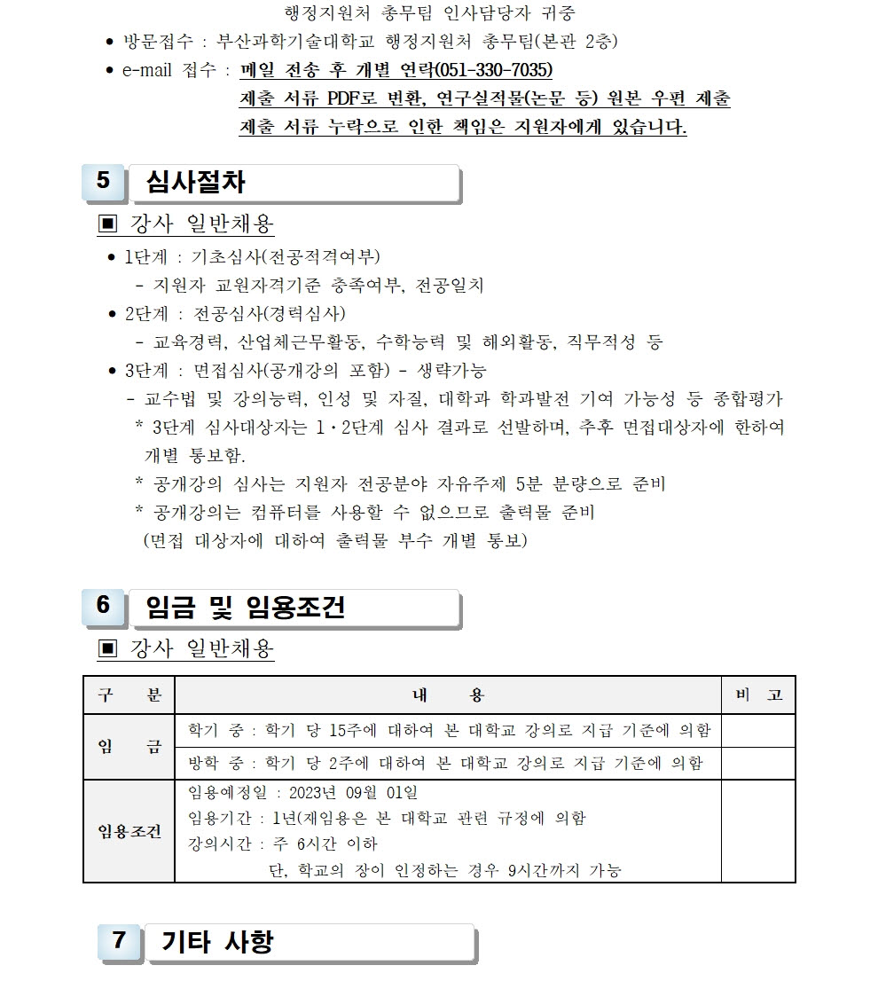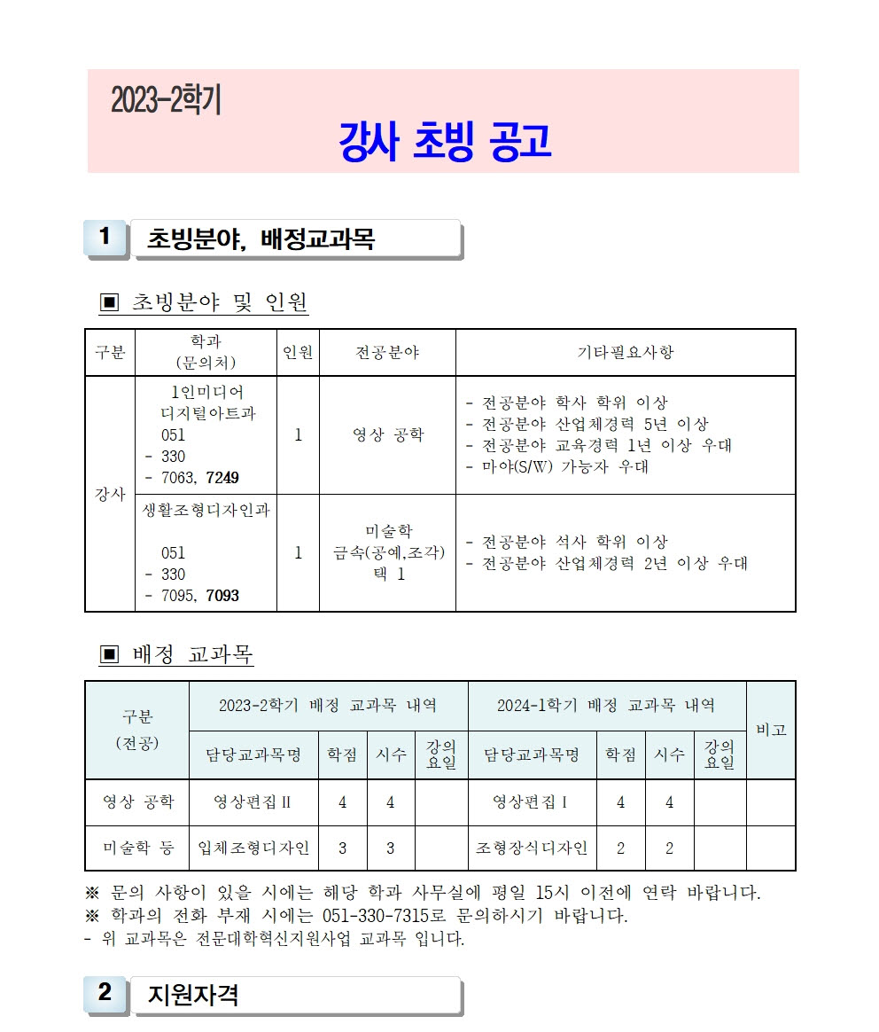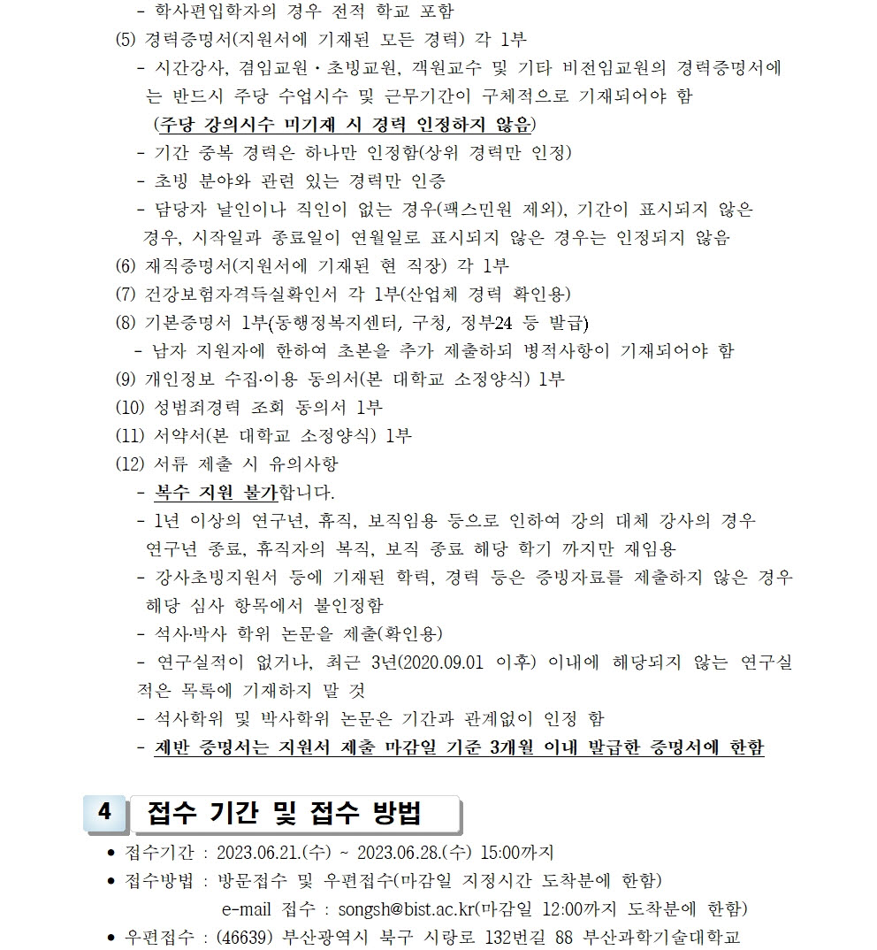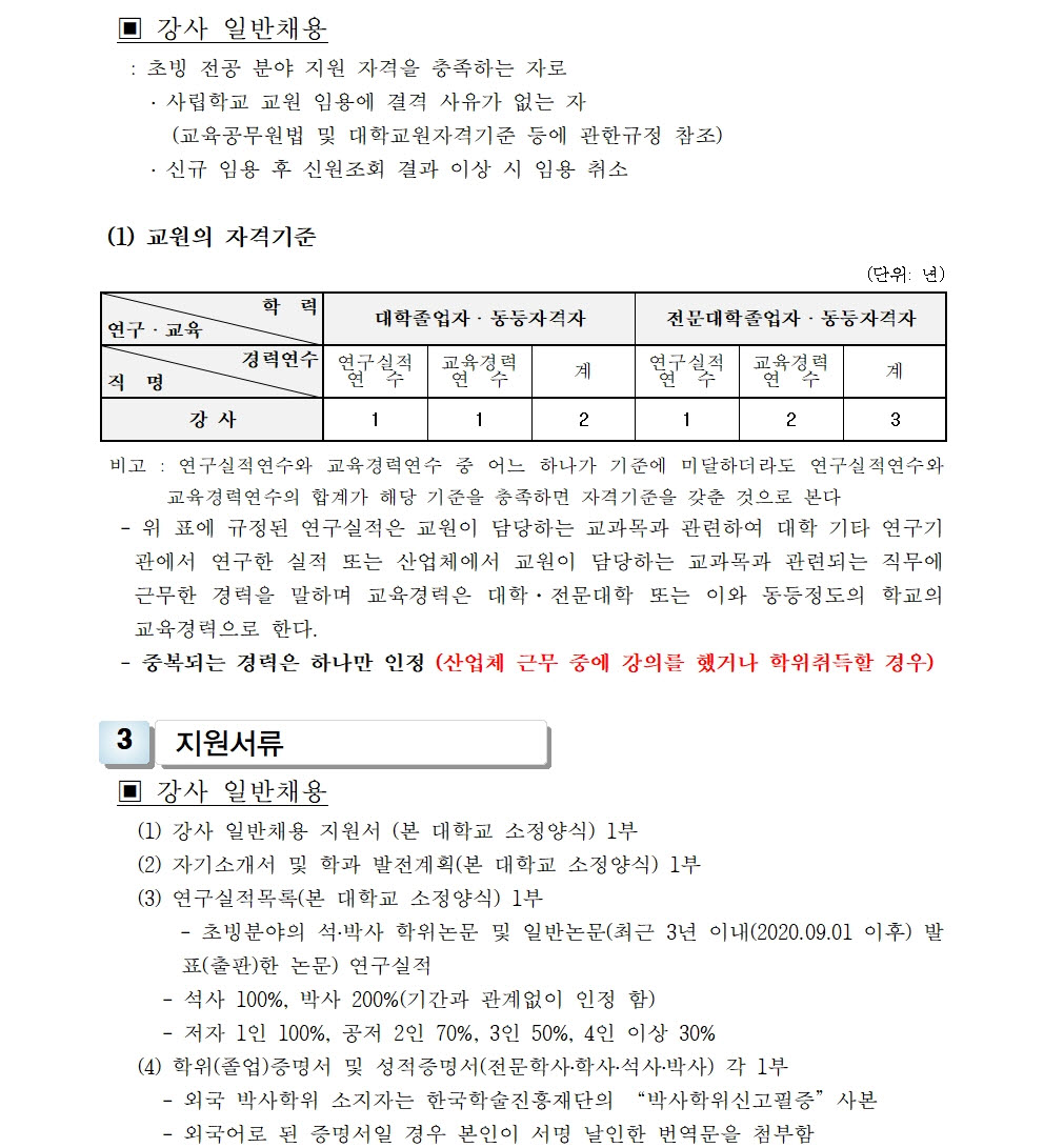 HOME > 기타 > 입찰/채용 입찰/채용 제목 [채용] 2023학년도 2학기 교원(강사) 초빙 공고 등록일 2023.06.14 08:06:37 작성자 행정지원처 첨부파일 1-1-3-가-1- 강사신규임용계획(공고문).pdf [188.26 KB]1-1-5. 강사 일반채용 구비서류.zip [186.40 KB] 조회 1749 이전글 [채용] 정년 전임교원 초빙 공고 다음글 [채용] 2023학년도 2학기 비전임 교원(겸임교원) 초빙 공고 목록 비밀글 비밀번호 입력 폼 비밀번호 입력 비밀번호를 입력하여 주세요. 관리자는 확인버튼만 누르시면 됩니다. 비밀번호 잘못된 비밀번호입니다. 비밀번호를 다시 입력해주세요. 확인