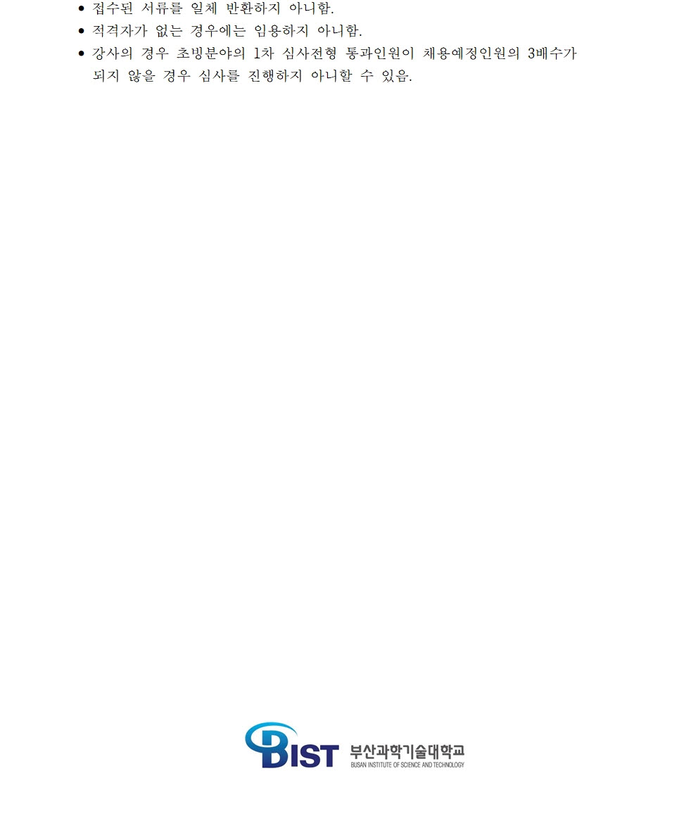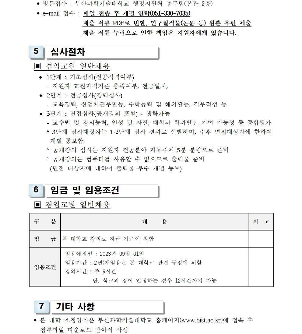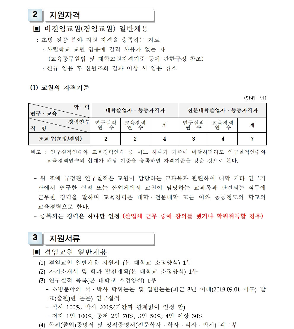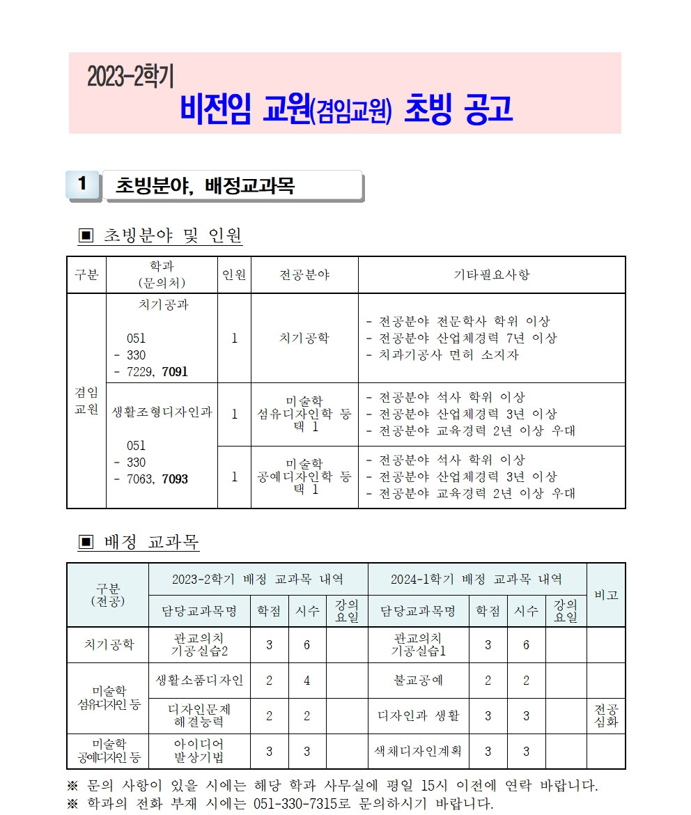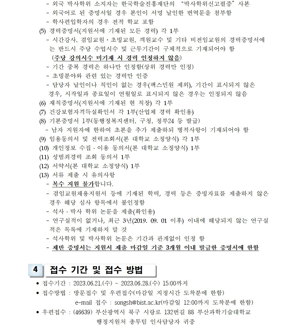 HOME > 기타 > 입찰/채용 입찰/채용 제목 [채용] 2023학년도 2학기 비전임 교원(겸임교원) 초빙 공고 등록일 2023.06.14 08:06:36 작성자 행정지원처 첨부파일 1-1-3-가- 신규임용계획(공고문).pdf [190.71 KB]1-1-4. 겸임교원 일반채용 구비서류.zip [209.05 KB] 조회 1784 이전글 [채용] 2023학년도 2학기 교원(강사) 초빙 공고 다음글 [채용] 부산과학기술대학교 계약직 직원 채용 공고 (환경미화) 목록 비밀글 비밀번호 입력 폼 비밀번호 입력 비밀번호를 입력하여 주세요. 관리자는 확인버튼만 누르시면 됩니다. 비밀번호 잘못된 비밀번호입니다. 비밀번호를 다시 입력해주세요. 확인