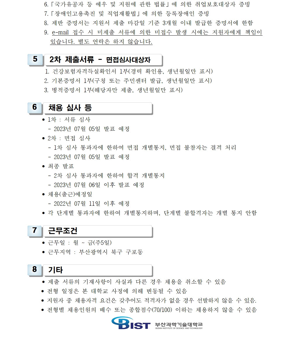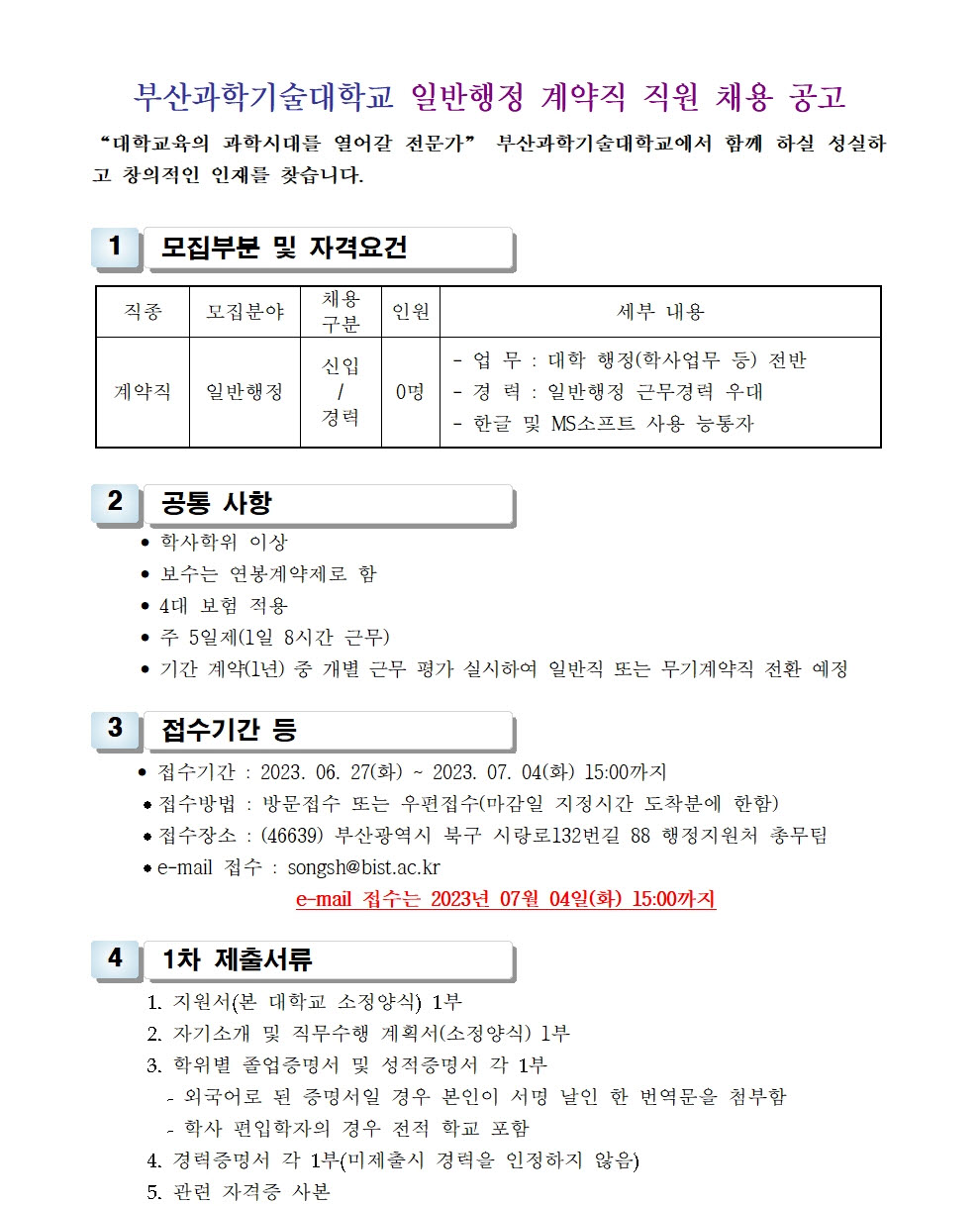 HOME > 기타 > 입찰/채용 입찰/채용 제목 [채용] 부산과학기술대학교 일반행정 계약직 직원 채용 공고 등록일 2023.06.20 14:06:08 작성자 행정지원처 첨부파일 1-2. 공고문(일반행정-계약).pdf [167.62 KB]1-3. 지원서 및 자기소개서(일반행정-계약).hwp [48.50 KB] 조회 1977 이전글 [채용] 부산과학기술대학교 계약직 직원 채용 공고 (환경미화) 다음글 [입찰] 조기취업형 계약하과 스마트장례 확장현실콘텐츠 개발 용역(협상에 의한 계약) 입찰(긴급) 목록 비밀글 비밀번호 입력 폼 비밀번호 입력 비밀번호를 입력하여 주세요. 관리자는 확인버튼만 누르시면 됩니다. 비밀번호 잘못된 비밀번호입니다. 비밀번호를 다시 입력해주세요. 확인