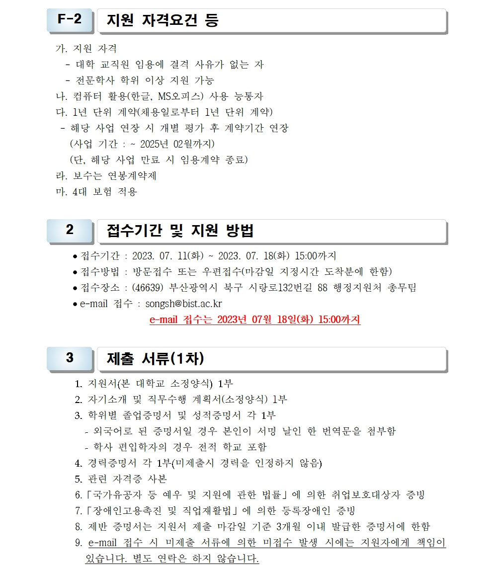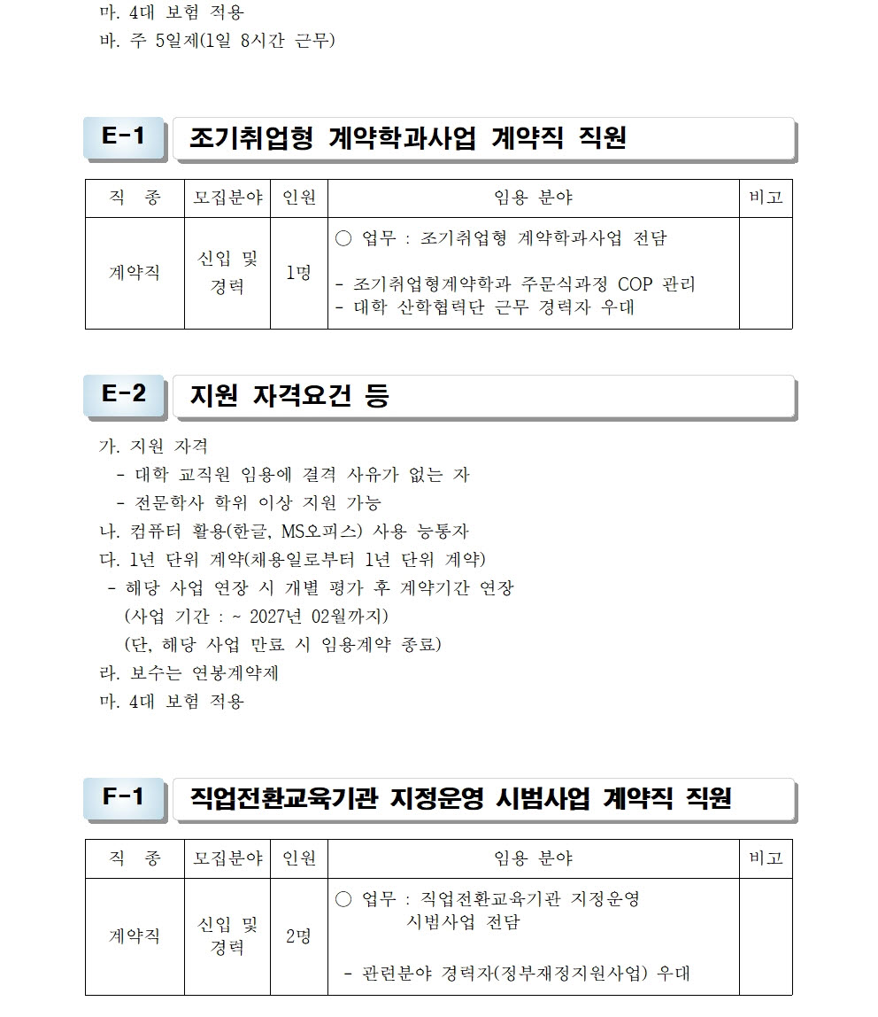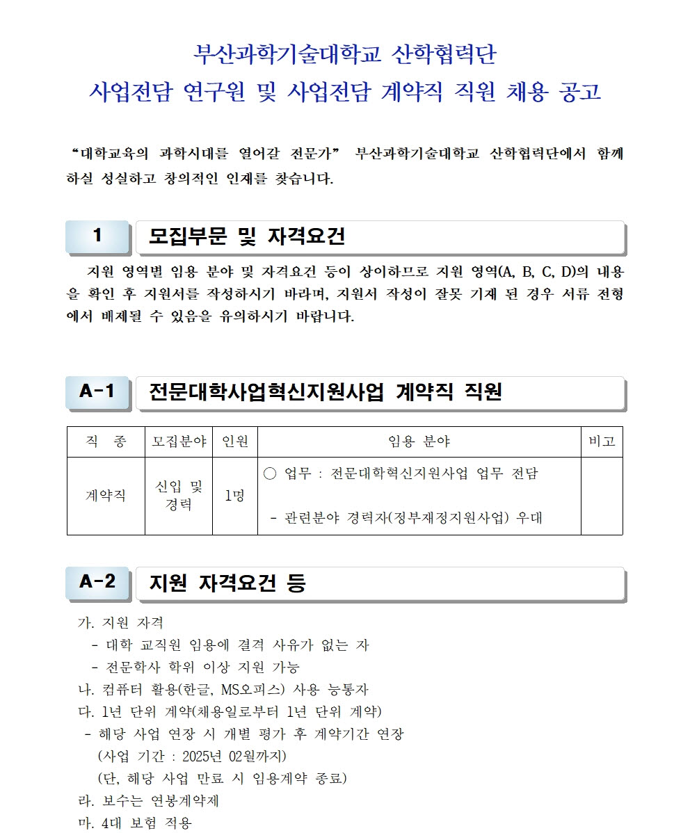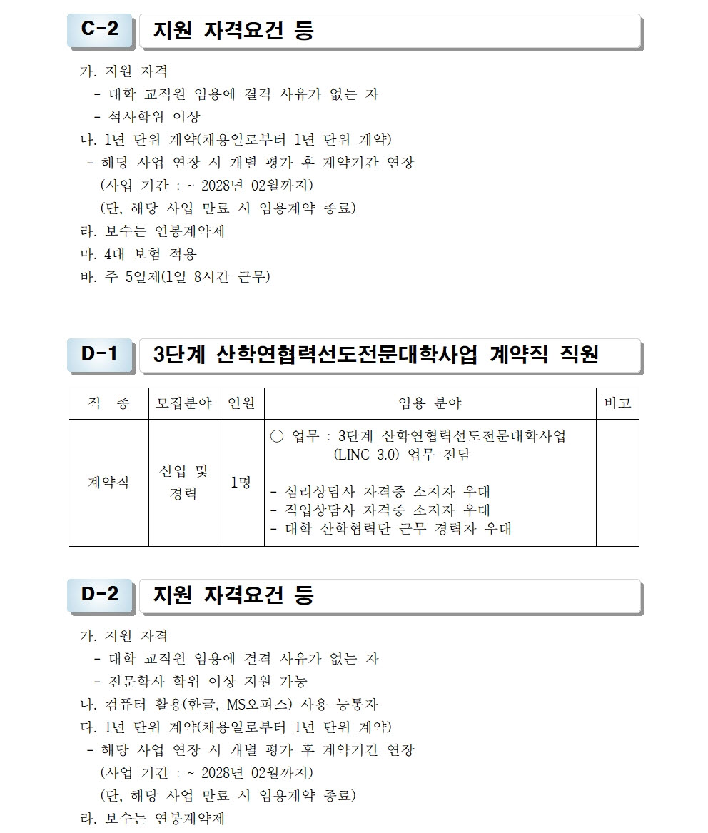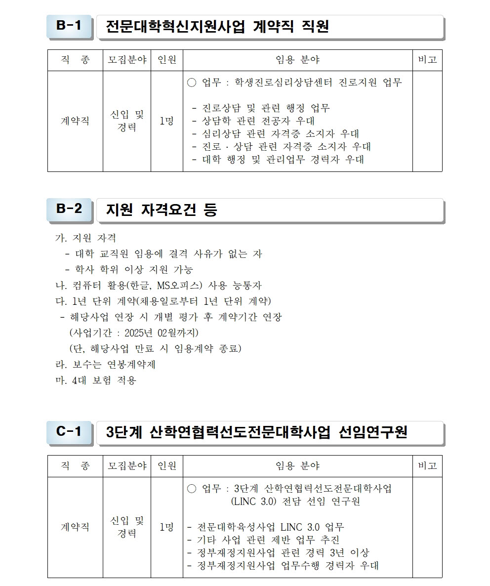HOME > 기타 > 입찰/채용 입찰/채용 제목 [채용] 산학협력단(전문대학혁신지원사업, 산학연협력선도전문대학사업, 조기취업형계약학과 등 ) 연구원 및 계약직 직원 채용 공고 등록일 2023.07.04 15:07:18 작성자 행정지원처 첨부파일 1-2. 공고문(혁신, linc3.0, 조기취업, hive2)-통합.pdf [423.03 KB]1-3. 지원서 및 자기소개서(계약직).hwp [91.00 KB] 조회 1665 이전글 [입찰] 조기취업형 계약하과 스마트장례 확장현실콘텐츠 개발 용역(협상에 의한 계약) 입찰(긴급) 다음글 [입찰] 조기취업형 계약학과 신입생모집 광고 홍보대행 용역(협상에 의한 계약) 입찰(긴급) 목록 비밀글 비밀번호 입력 폼 비밀번호 입력 비밀번호를 입력하여 주세요. 관리자는 확인버튼만 누르시면 됩니다. 비밀번호 잘못된 비밀번호입니다. 비밀번호를 다시 입력해주세요. 확인
