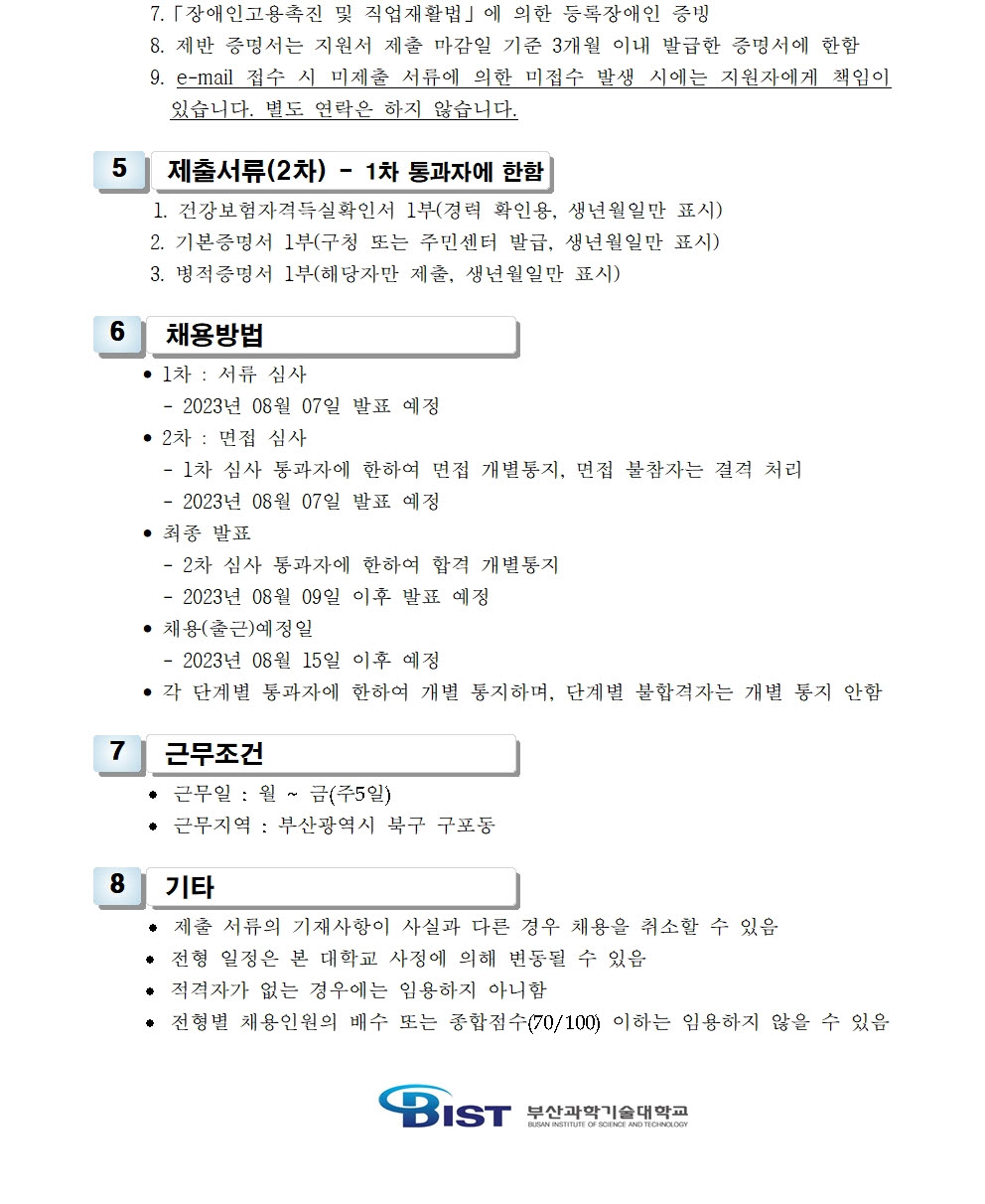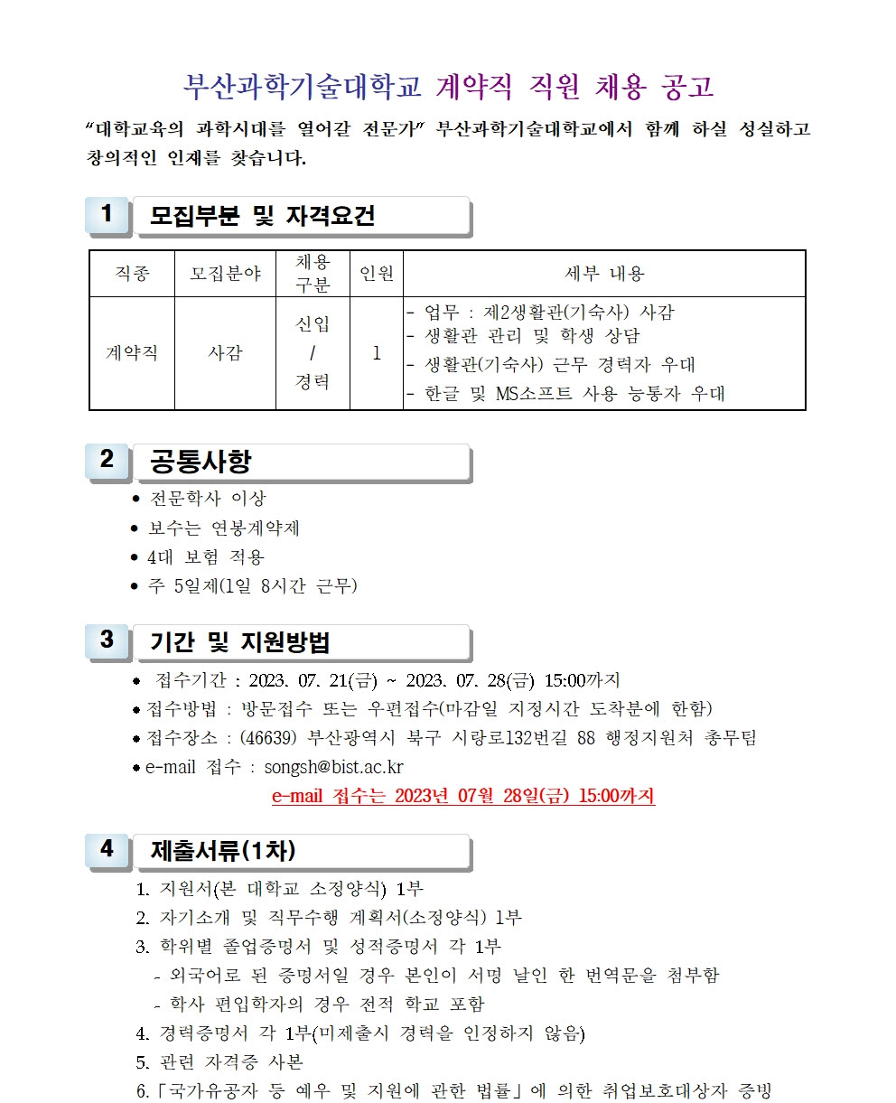 HOME > 기타 > 입찰/채용 입찰/채용 제목 [채용] 부산과학기술대학교 계약직 직원(사감) 채용 공고 등록일 2023.07.17 08:07:04 작성자 행정지원처 첨부파일 1-2. 공고문(사감).pdf [170.88 KB]1-3. 지원서 및 자기소개서(계약직).hwp [48.00 KB] 조회 1594 이전글 [입찰] 대학혁신 실습실 환경개선공사 입찰(긴급) 다음글 [채용] 비정년 전임교원 초빙 공고 목록 비밀글 비밀번호 입력 폼 비밀번호 입력 비밀번호를 입력하여 주세요. 관리자는 확인버튼만 누르시면 됩니다. 비밀번호 잘못된 비밀번호입니다. 비밀번호를 다시 입력해주세요. 확인