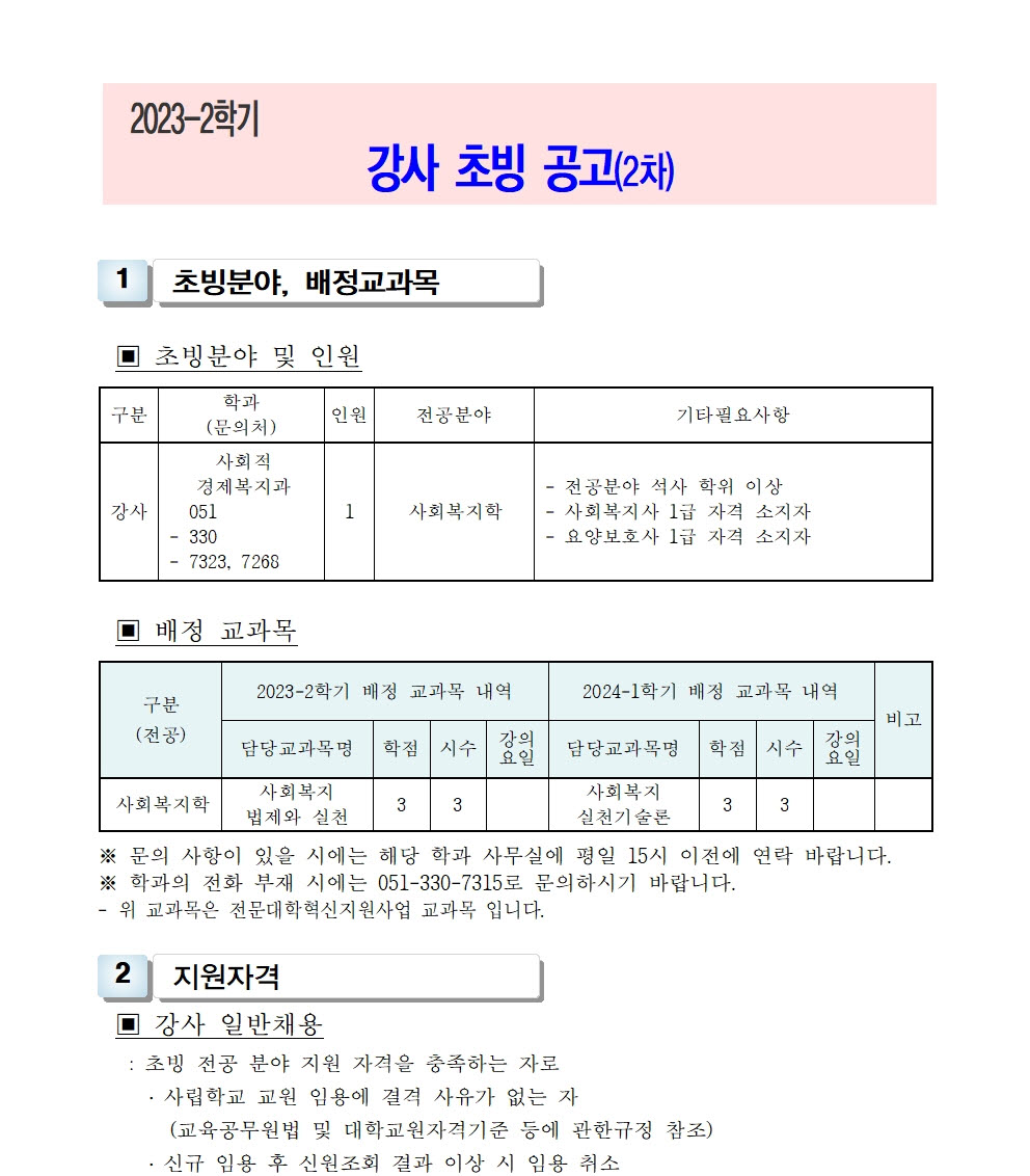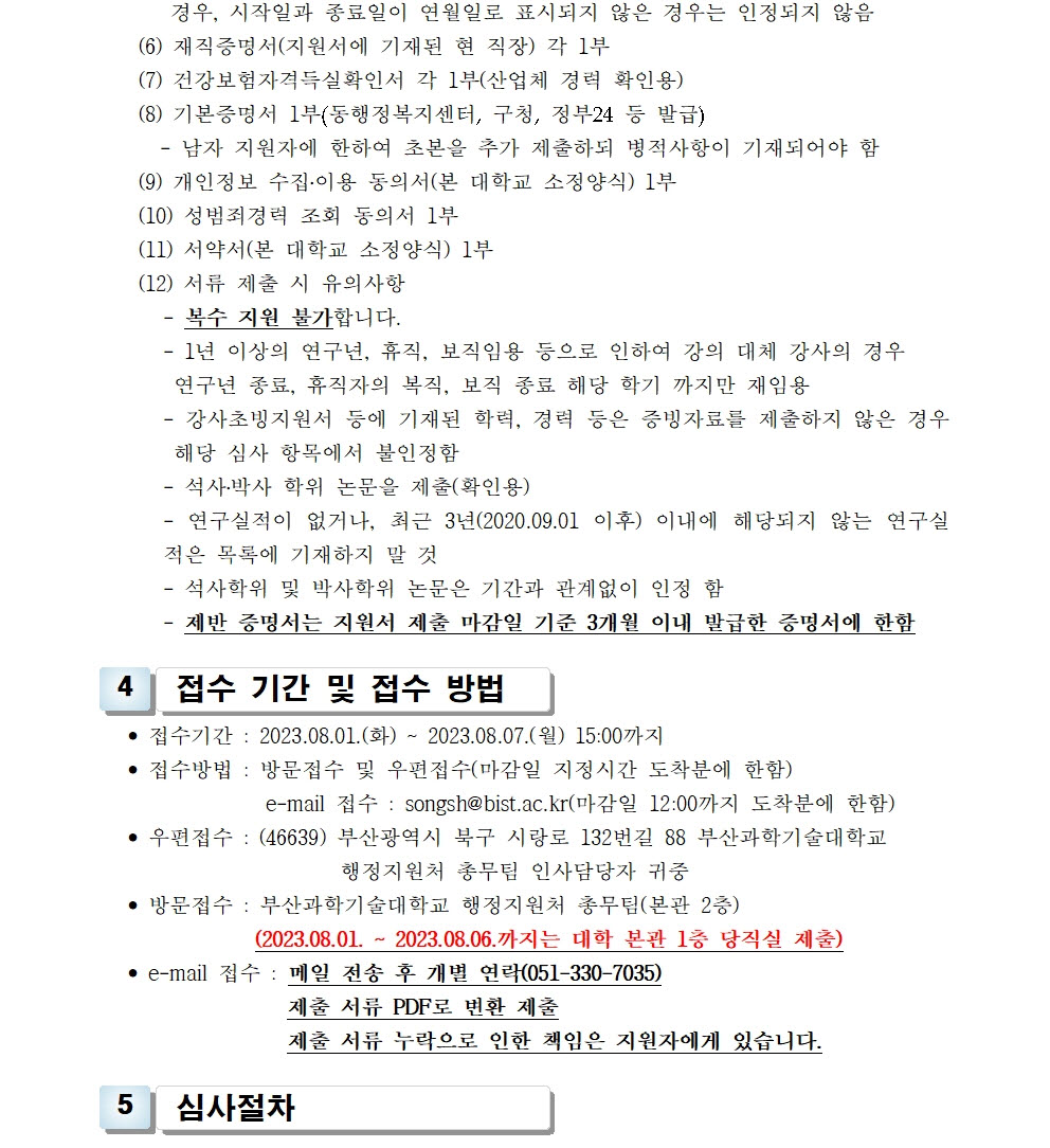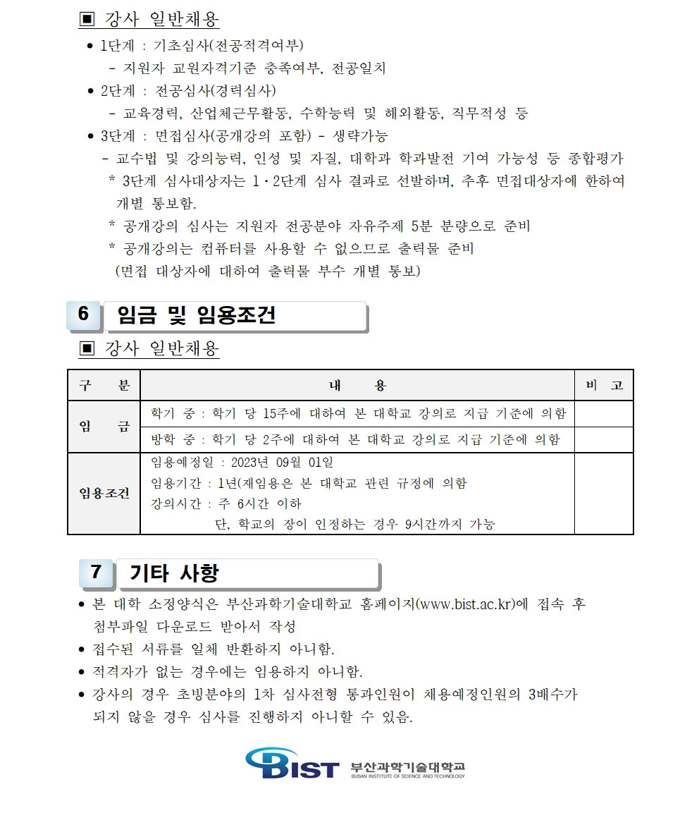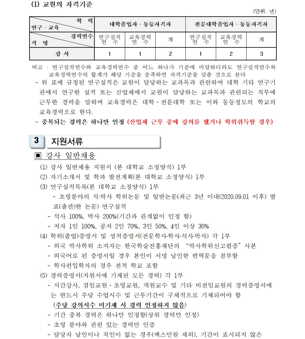 HOME > 기타 > 입찰/채용 입찰/채용 제목 [채용] 2023학년도 2학기 교원(강사) 초빙 공고(2차) 등록일 2023.07.21 10:07:43 작성자 행정지원처 첨부파일 1-1-5. 강사 일반채용 구비서류(2차).zip [185.97 KB]1-1-3-가-1- 강사신규임용계획(공고문).pdf [181.59 KB] 조회 1709 이전글 [채용] 비정년 전임교원 초빙 공고 다음글 [입찰] LINC3.0 스마트 정상분만 확장현실콘텐츠 개발 용역(협상에 의한 계약) 입찰(긴급) 목록 비밀글 비밀번호 입력 폼 비밀번호 입력 비밀번호를 입력하여 주세요. 관리자는 확인버튼만 누르시면 됩니다. 비밀번호 잘못된 비밀번호입니다. 비밀번호를 다시 입력해주세요. 확인