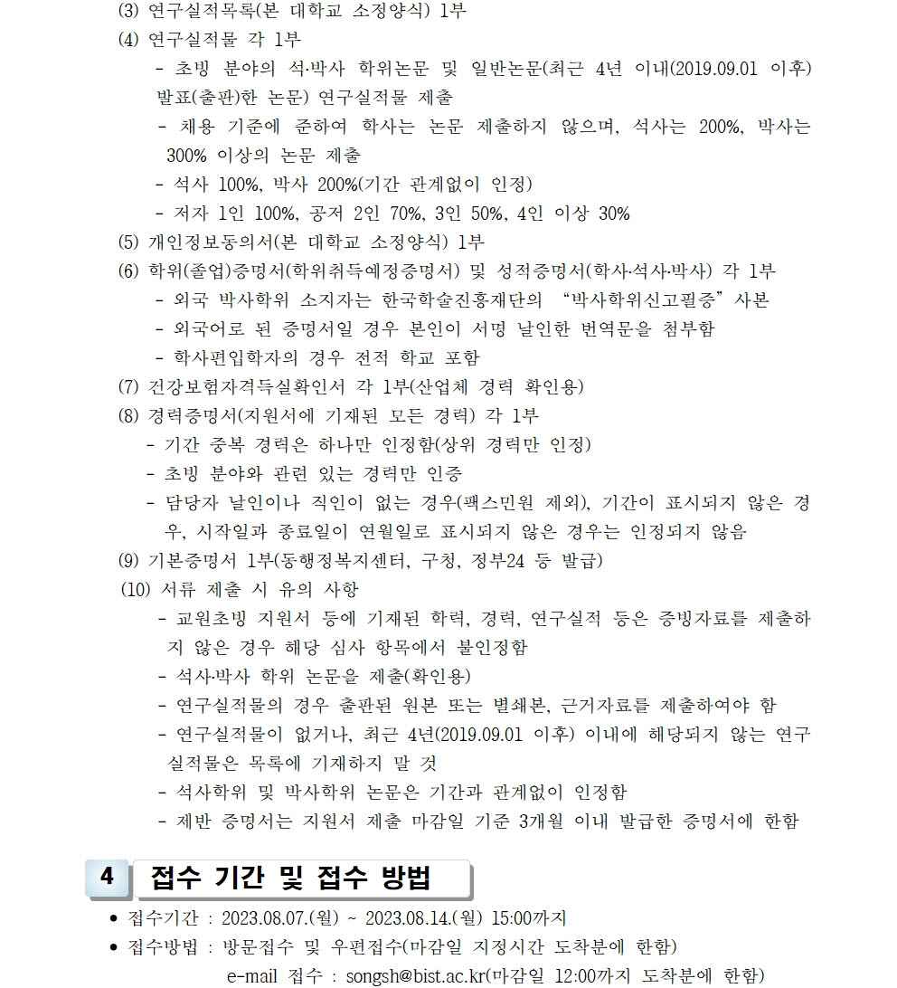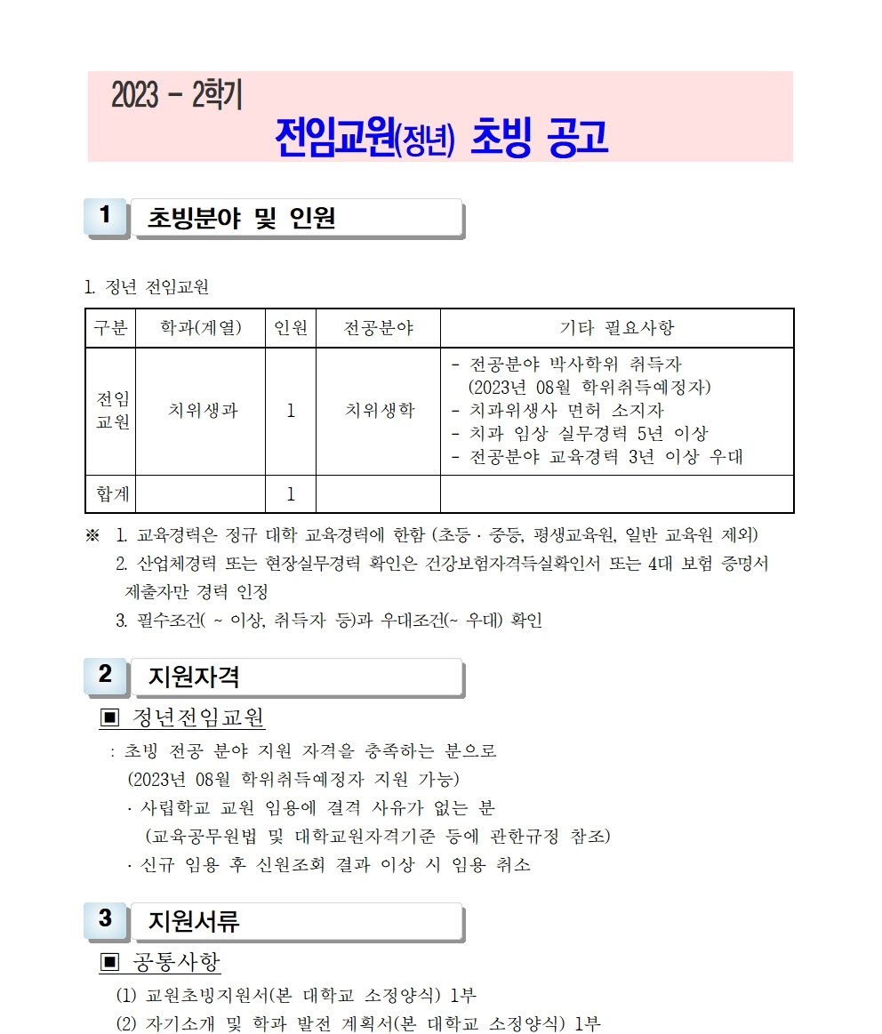 HOME > 기타 > 입찰/채용 입찰/채용 제목 [채용] 정년 전임교원(치위생과) 초빙 공고 등록일 2023.07.28 11:07:00 작성자 행정지원처 첨부파일 1-1-3-가. 신규임용계획(공고문).pdf [749.60 KB]1-1-3-가. 내외부공고-첨부서류.zip [149.35 KB] 조회 1843 이전글 [채용] 2023학년도 2학기 교원(강사) 초빙 공고(3차) 다음글 [채용] 국제교육원 어학센터 한국어 강사 모집 목록 비밀글 비밀번호 입력 폼 비밀번호 입력 비밀번호를 입력하여 주세요. 관리자는 확인버튼만 누르시면 됩니다. 비밀번호 잘못된 비밀번호입니다. 비밀번호를 다시 입력해주세요. 확인