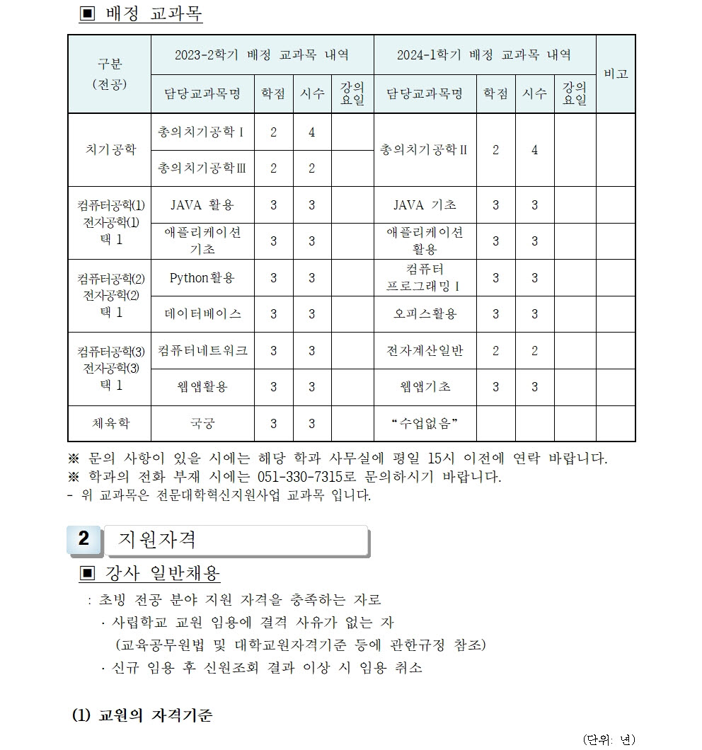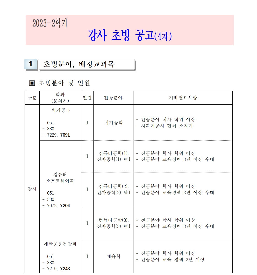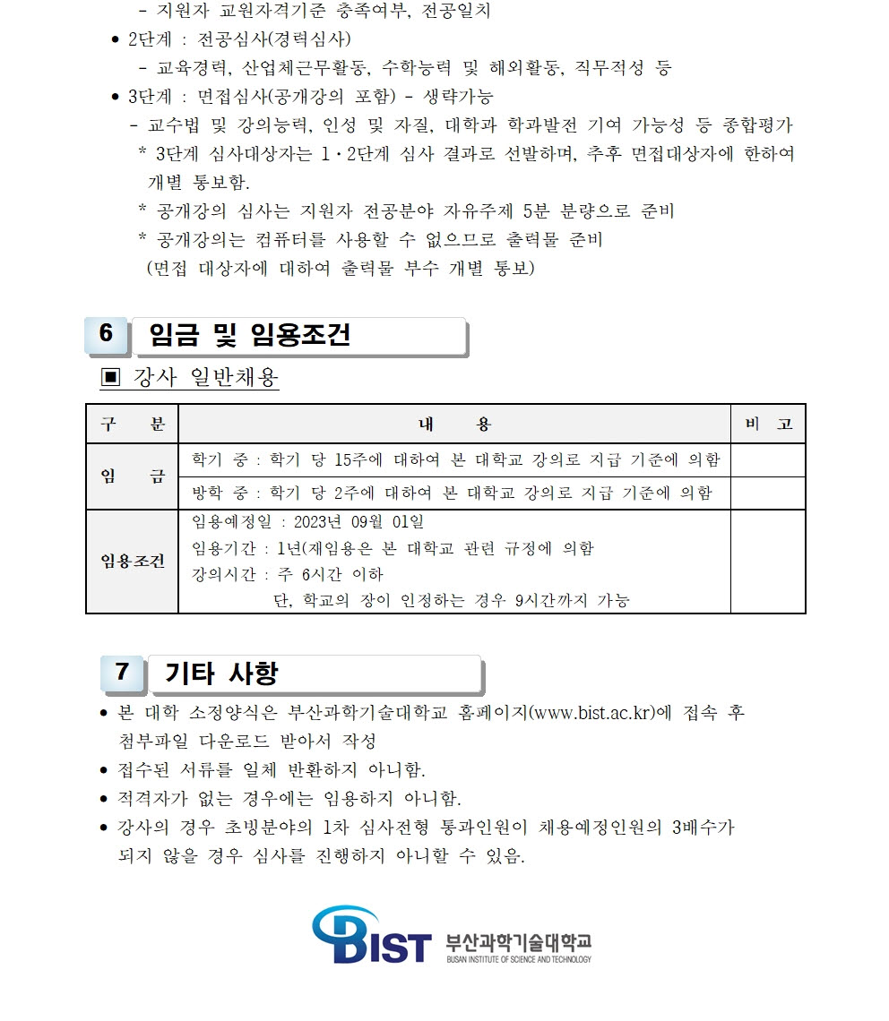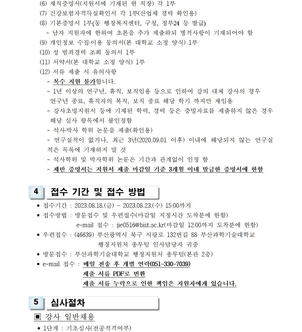 HOME > 기타 > 입찰/채용 입찰/채용 제목 [채용] 2023학년도 2학기 교원(강사) 초빙 공고(4차) 등록일 2023.08.16 15:08:27 작성자 행정지원처 첨부파일 1-1-3-가-1- 강사신규임용계획(공고문).pdf [200.95 KB]1-1-5. 강사 일반채용 구비서류(4차).zip [53.85 KB] 조회 1819 이전글 [채용] 부산과학기술대학교 계약직 직원 채용 공고 (환경미화) 다음글 [채용] 산학협력단 사업전담 계약직 직원 채용 공고 목록 비밀글 비밀번호 입력 폼 비밀번호 입력 비밀번호를 입력하여 주세요. 관리자는 확인버튼만 누르시면 됩니다. 비밀번호 잘못된 비밀번호입니다. 비밀번호를 다시 입력해주세요. 확인