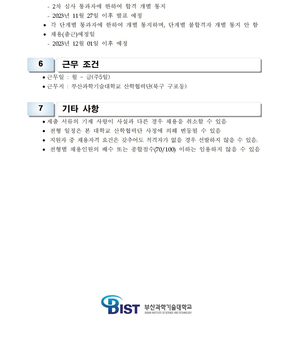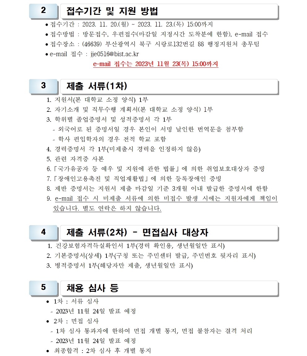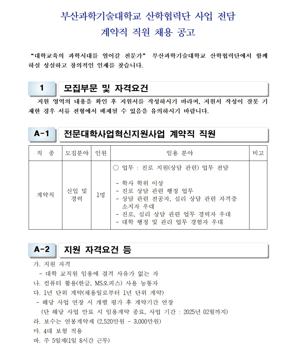 HOME > 기타 > 입찰/채용 입찰/채용 제목 [채용] 부산과학기술대학교 산학협력단 (전문대학혁신지원사업) 계약직 직원 채용 등록일 2023.11.09 10:11:05 작성자 행정지원처 첨부파일 1-3. 지원서 및 자기소개서(산학협력단).hwp [44.50 KB] 조회 1596 이전글 [입찰] LINC3.0 / 대학혁신 기자재 구입(치기공 고주파주조기 등) 입찰의 건 다음글 [입찰] 학교법인 중앙학원 수익용 기본재산 부동산(토지) 매각 입찰 공고 목록 비밀글 비밀번호 입력 폼 비밀번호 입력 비밀번호를 입력하여 주세요. 관리자는 확인버튼만 누르시면 됩니다. 비밀번호 잘못된 비밀번호입니다. 비밀번호를 다시 입력해주세요. 확인