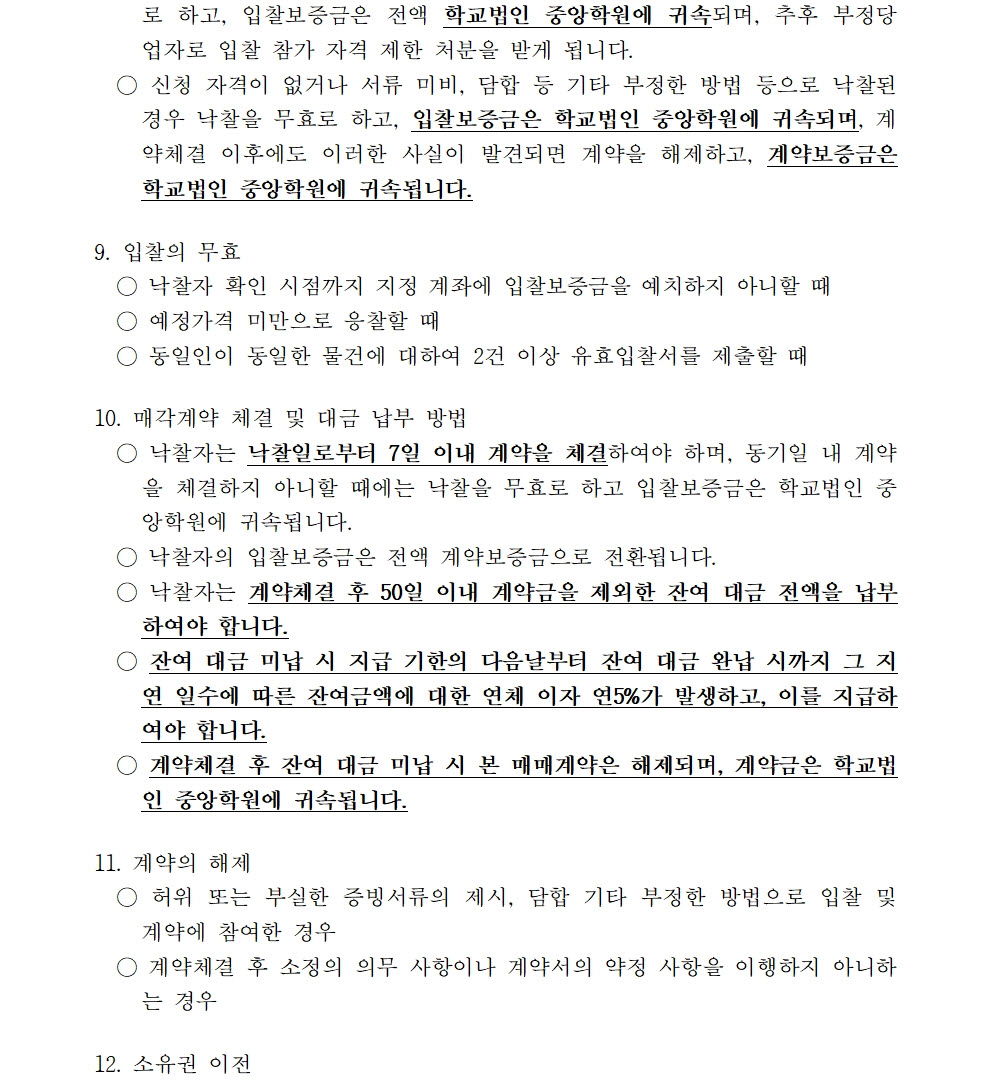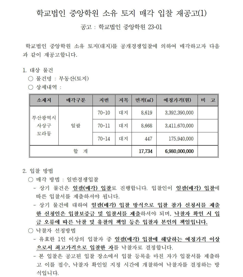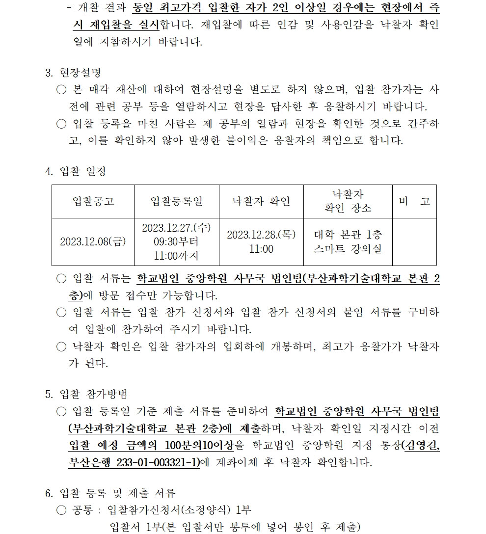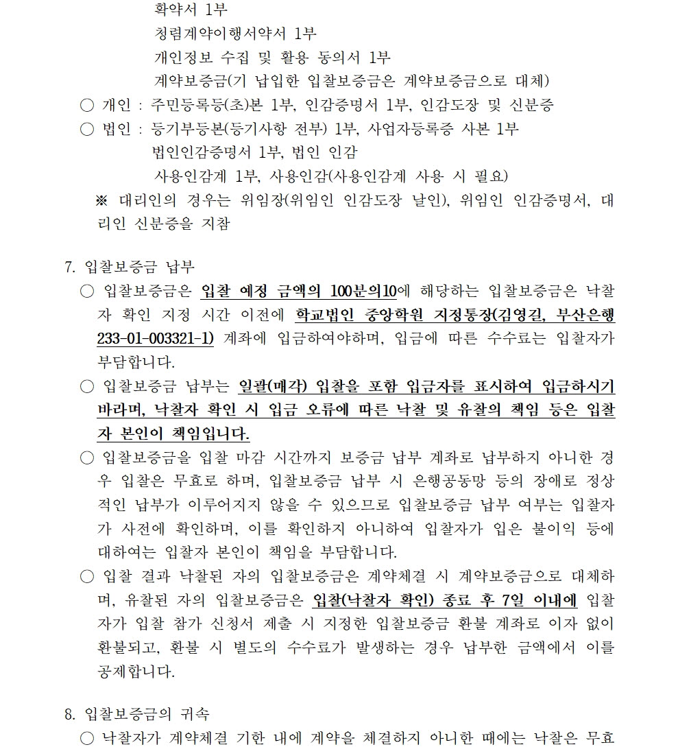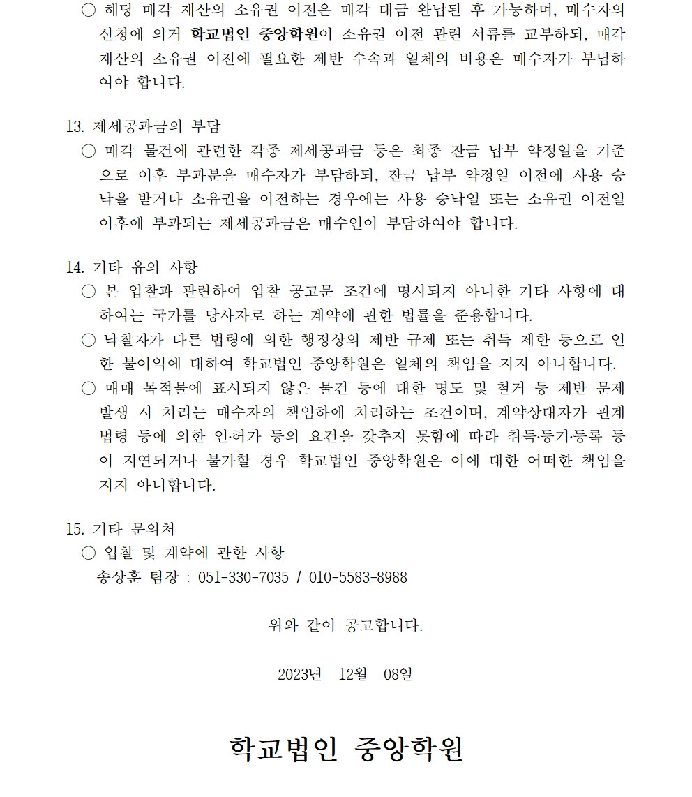 HOME > 기타 > 입찰/채용 입찰/채용 제목 [입찰] 학교법인 중앙학원 수익용 기본재산 부동산(토지) 매각 입찰 재공고(1) 등록일 2023.12.08 08:12:08 작성자 행정지원처 첨부파일 붙임9. 입찰참가 서류 양식(23-1, 재공고-1).zip [712.25 KB] 조회 1235 이전글 [입찰] 2023학년 대학혁신 지원사업 실습실 환경개선 공사 입찰(긴급) 다음글 [입찰] 산업체 맞춤형 DX직업전환 기업요구직무분석 및 과정개발 컨설팅 용역(긴급) 목록 비밀글 비밀번호 입력 폼 비밀번호 입력 비밀번호를 입력하여 주세요. 관리자는 확인버튼만 누르시면 됩니다. 비밀번호 잘못된 비밀번호입니다. 비밀번호를 다시 입력해주세요. 확인