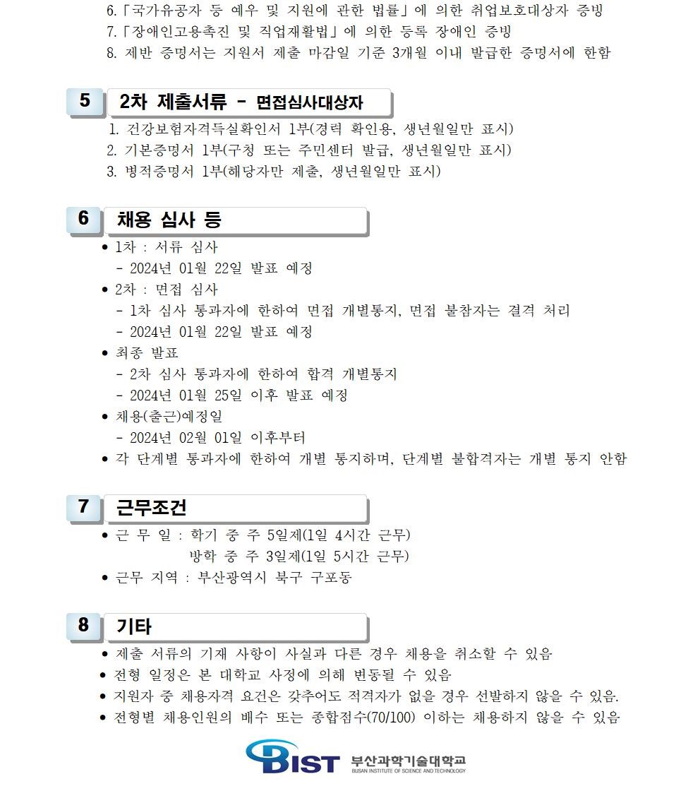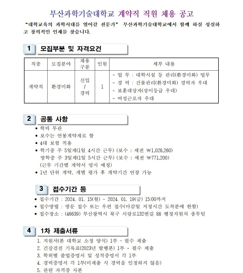 HOME > 기타 > 입찰/채용 입찰/채용 제목 [채용] 부산과학기술대학교 계약직 직원(환경미화) 채용 공고 등록일 2024.01.04 15:01:31 작성자 행정지원처 첨부파일 1-3-3. 직원채용_지원서.hwp [48.00 KB]1-2. 공고문(시설관리-환경).pdf [160.84 KB] 조회 1383 이전글 [채용] 부산과학기술대학교 계약직 직원(행정) 채용 공고 다음글 [입찰] 대학혁신지원사업 1유형 기자재(관장실습모형 등) 입찰 공고 목록 비밀글 비밀번호 입력 폼 비밀번호 입력 비밀번호를 입력하여 주세요. 관리자는 확인버튼만 누르시면 됩니다. 비밀번호 잘못된 비밀번호입니다. 비밀번호를 다시 입력해주세요. 확인
