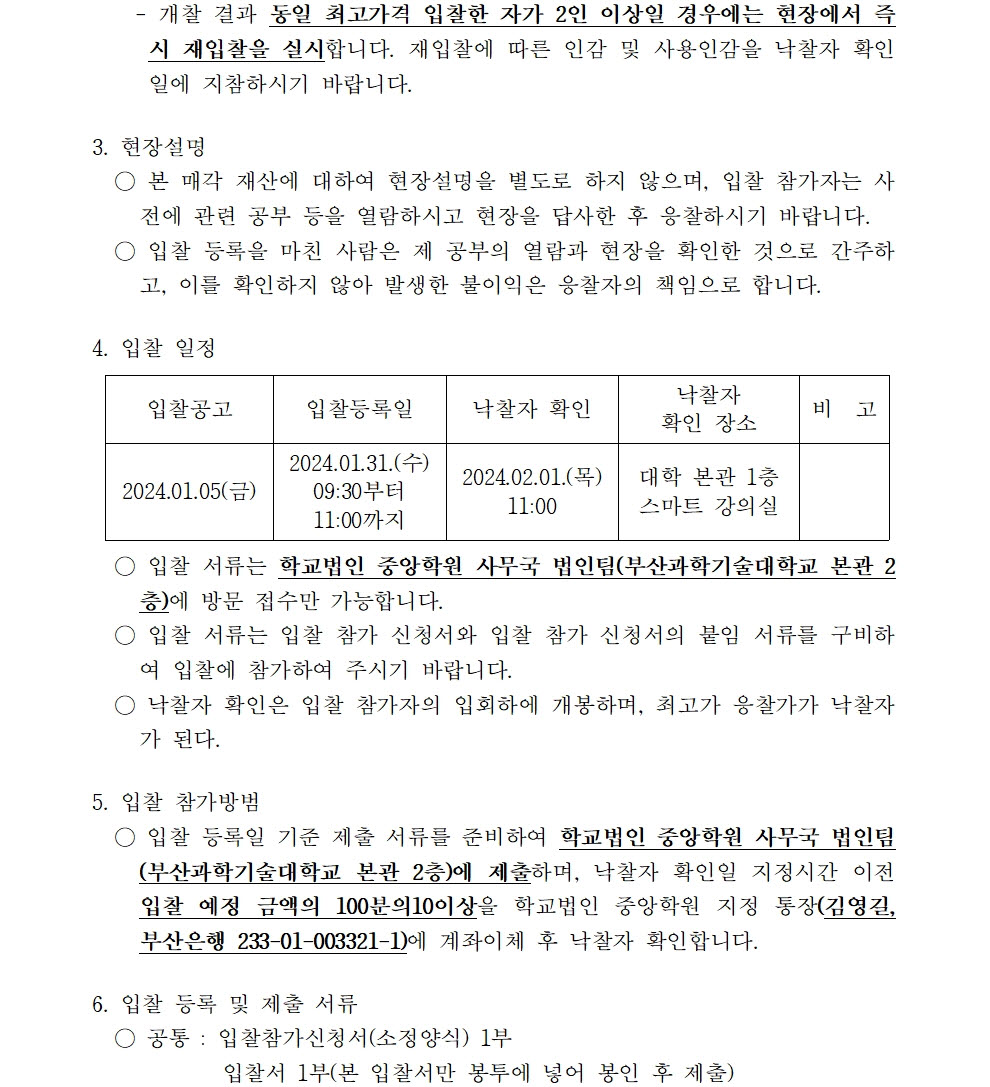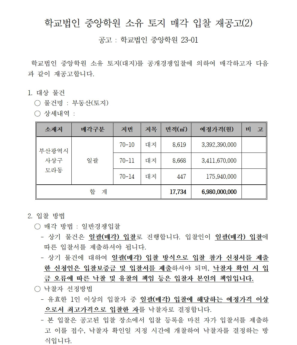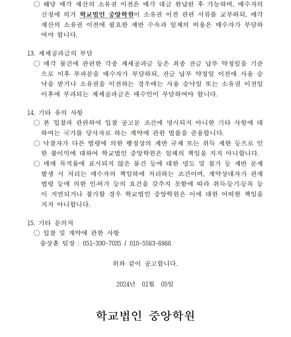 HOME > 기타 > 입찰/채용 입찰/채용 제목 [입찰] 학교법인 중앙학원 수익용 기본재산 부동산(토지) 매각 입찰 재공고(2) 등록일 2024.01.05 09:01:42 작성자 행정지원처 첨부파일 붙임9. 입찰참가 서류 양식(23-1, 재공고-2).zip [715.02 KB] 조회 1279 이전글 [입찰] 대학혁신지원사업 1유형 기자재(관장실습모형 등) 입찰 공고 다음글 [입찰] 대학혁신지원사업 2유형 기자재 구입(치기공밀링장비 등)입찰 공고 목록 비밀글 비밀번호 입력 폼 비밀번호 입력 비밀번호를 입력하여 주세요. 관리자는 확인버튼만 누르시면 됩니다. 비밀번호 잘못된 비밀번호입니다. 비밀번호를 다시 입력해주세요. 확인