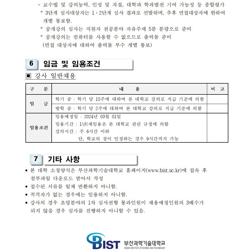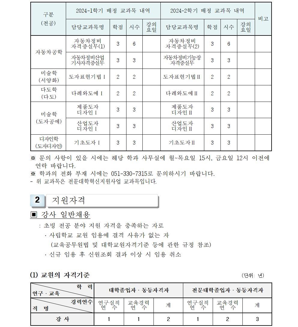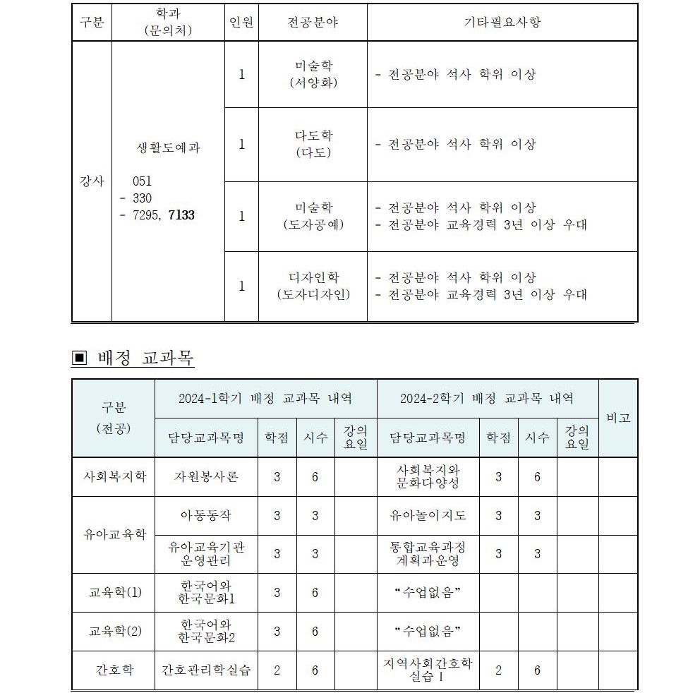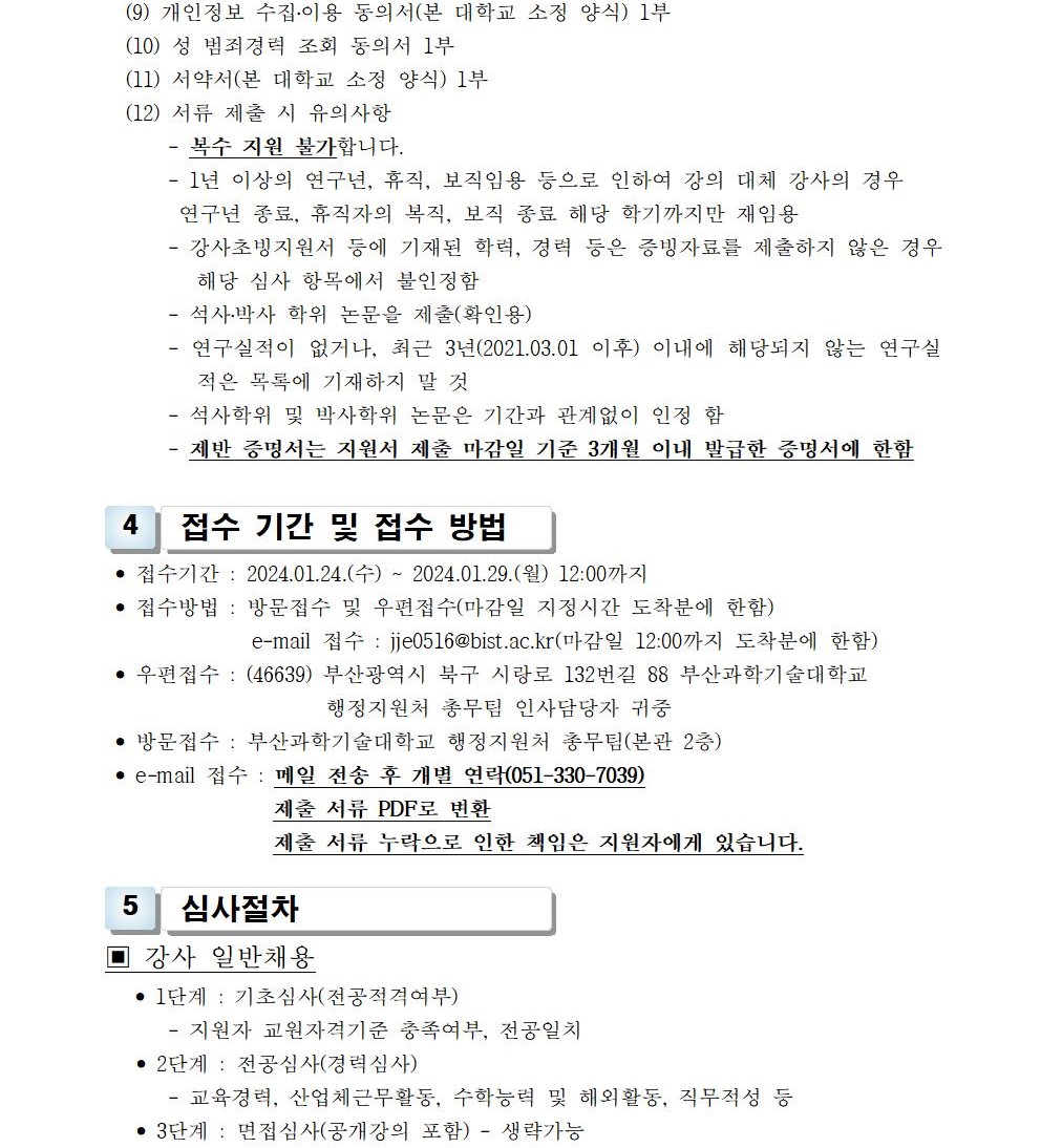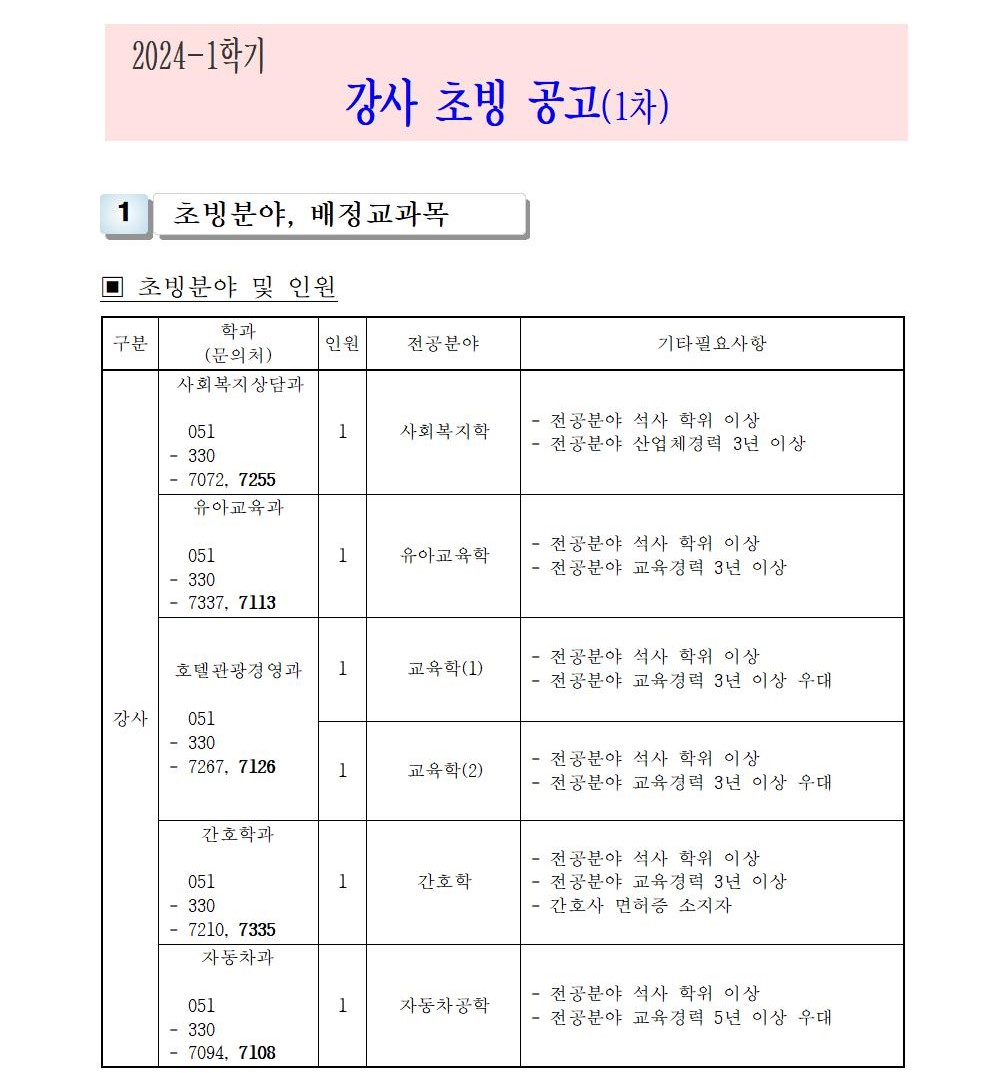 HOME > 기타 > 입찰/채용 입찰/채용 제목 [채용] 2024학년도 1학기 교원(강사) 초빙 공고(1차) 등록일 2024.01.22 13:01:11 작성자 행정지원처 첨부파일 1-1-5. 강사 일반채용 구비서류(1차).zip [183.43 KB]1-1-3-가-1- 강사신규임용계획(공고문).pdf [217.43 KB] 조회 1747 이전글 [입찰] 대학혁신지원사업 2유형 기자재 구입(치기공밀링장비 등) 입찰 재공고(긴급) 다음글 [입찰] 2023학년 HiVE 2유형 DX실습실 환경개선 공사 입찰 공고(긴급) 목록 비밀글 비밀번호 입력 폼 비밀번호 입력 비밀번호를 입력하여 주세요. 관리자는 확인버튼만 누르시면 됩니다. 비밀번호 잘못된 비밀번호입니다. 비밀번호를 다시 입력해주세요. 확인