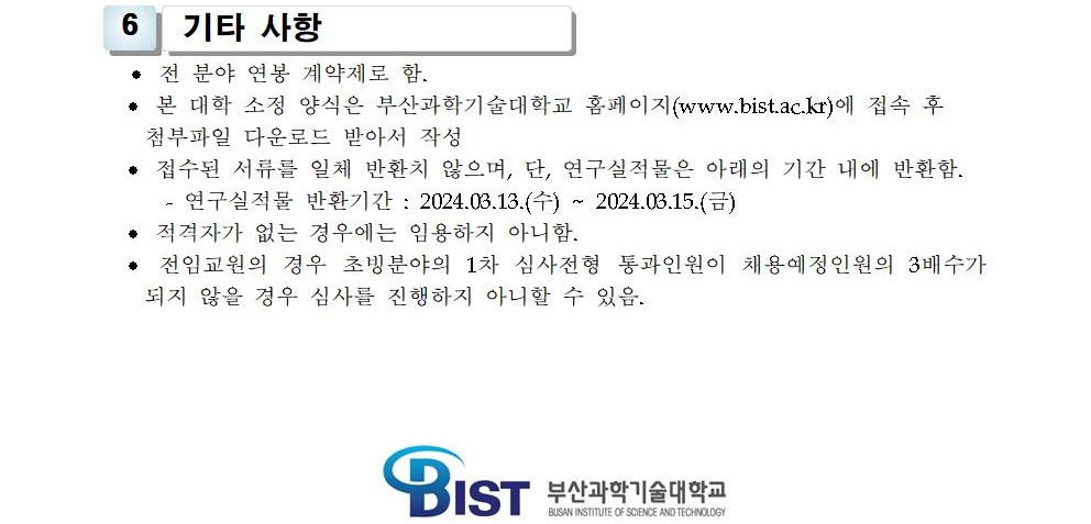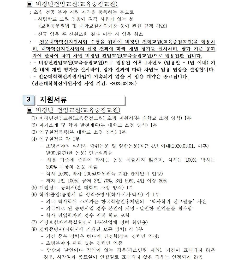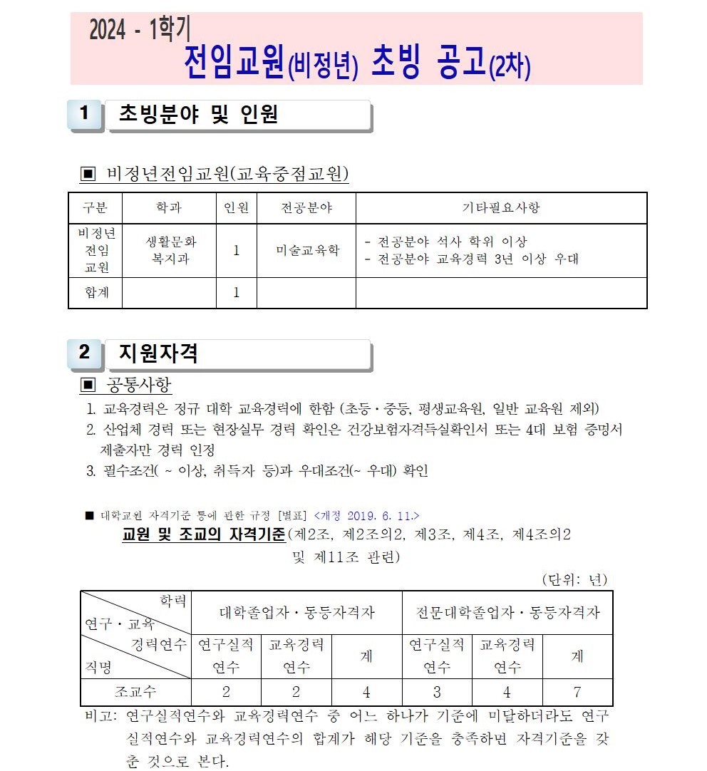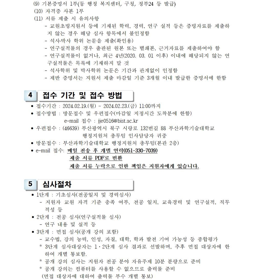 HOME > 기타 > 입찰/채용 입찰/채용 제목 [채용] 비정년 전임교원 초빙 공고(2차) 등록일 2024.02.08 11:02:33 작성자 행정지원처 첨부파일 1-1-3-가- 신규임용계획(공고문).pdf [217.27 KB]1-1-3-가 비정년전임교원 구비서류.zip [308.47 KB] 조회 1642 이전글 [입찰] 부산과학기술대학교 편의시설(매점,자판기) 위탁운영 입찰 재공고(긴급) 다음글 [채용] 2024학년도 1학기 교원(강사) 초빙 공고(2차) 목록 비밀글 비밀번호 입력 폼 비밀번호 입력 비밀번호를 입력하여 주세요. 관리자는 확인버튼만 누르시면 됩니다. 비밀번호 잘못된 비밀번호입니다. 비밀번호를 다시 입력해주세요. 확인