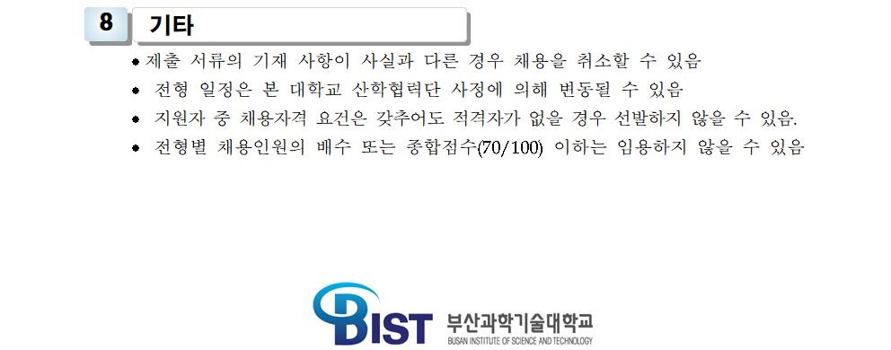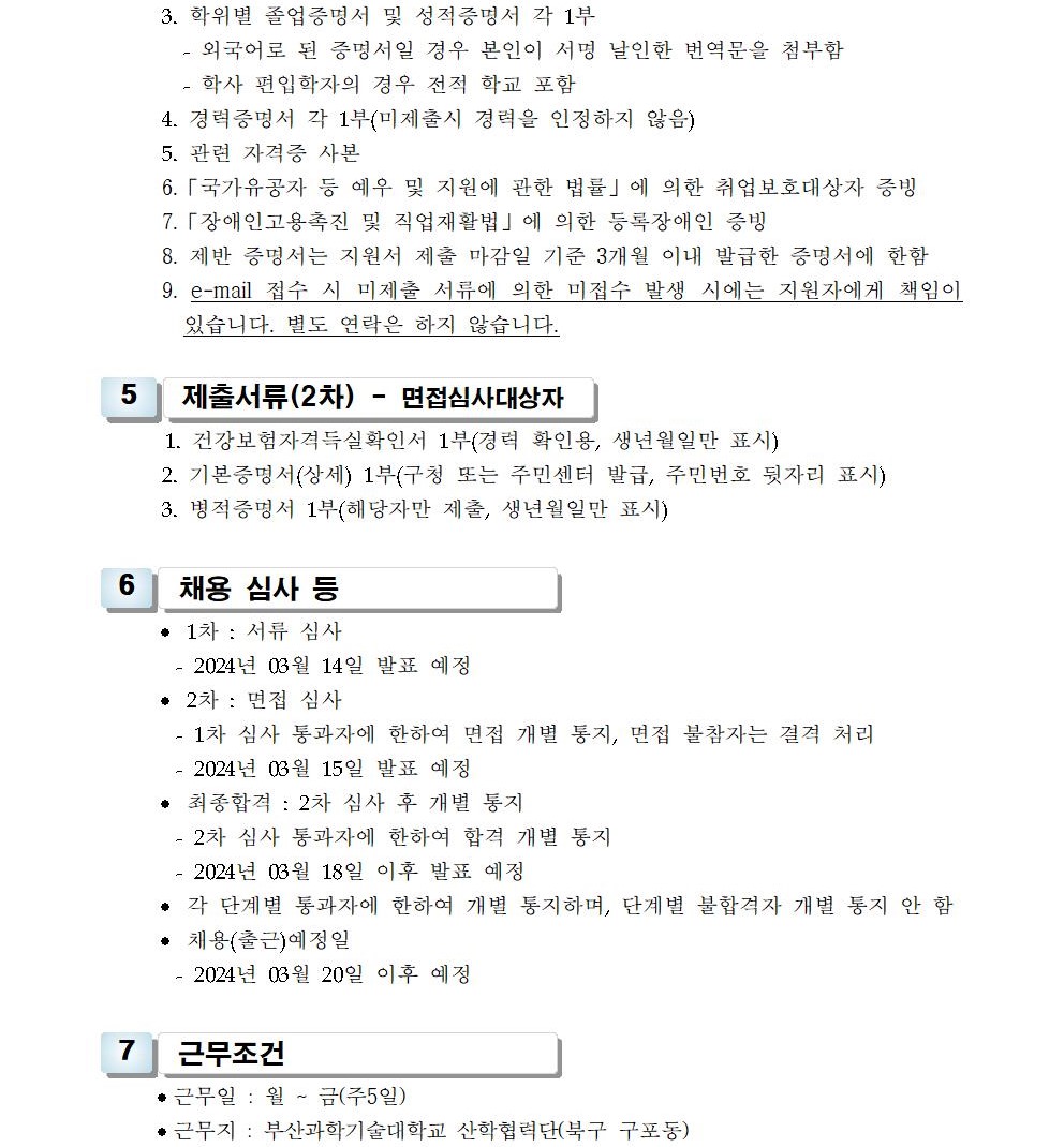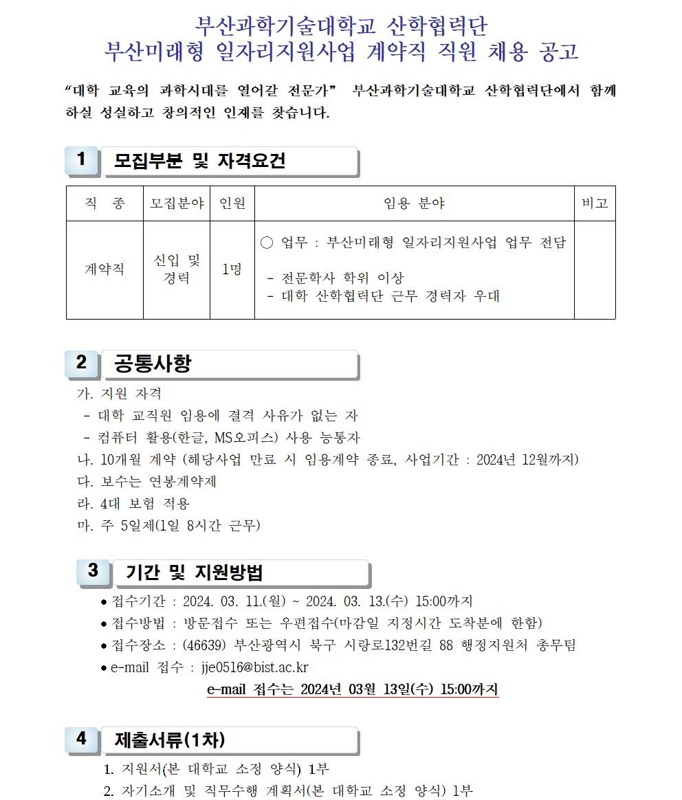 HOME > 기타 > 입찰/채용 입찰/채용 제목 [채용] 산학협력단 (부산미래형 일자리지원사업) 계약직 직원 채용 등록일 2024.02.28 11:02:36 작성자 행정지원처 첨부파일 1-2. 공고문(부산미래형).pdf [182.17 KB]1-3. 지원서 및 자기소개서(산학협력단).hwp [45.00 KB] 조회 1405 이전글 [입찰] 부산과학기술대학교 편의시설(매점,자판기) 위탁운영 입찰 재공고(긴급) 다음글 [입찰] 학교법인 중앙학원 수익용 기본재산 부동산(토지) 매각 입찰 재공고(3) 목록 비밀글 비밀번호 입력 폼 비밀번호 입력 비밀번호를 입력하여 주세요. 관리자는 확인버튼만 누르시면 됩니다. 비밀번호 잘못된 비밀번호입니다. 비밀번호를 다시 입력해주세요. 확인