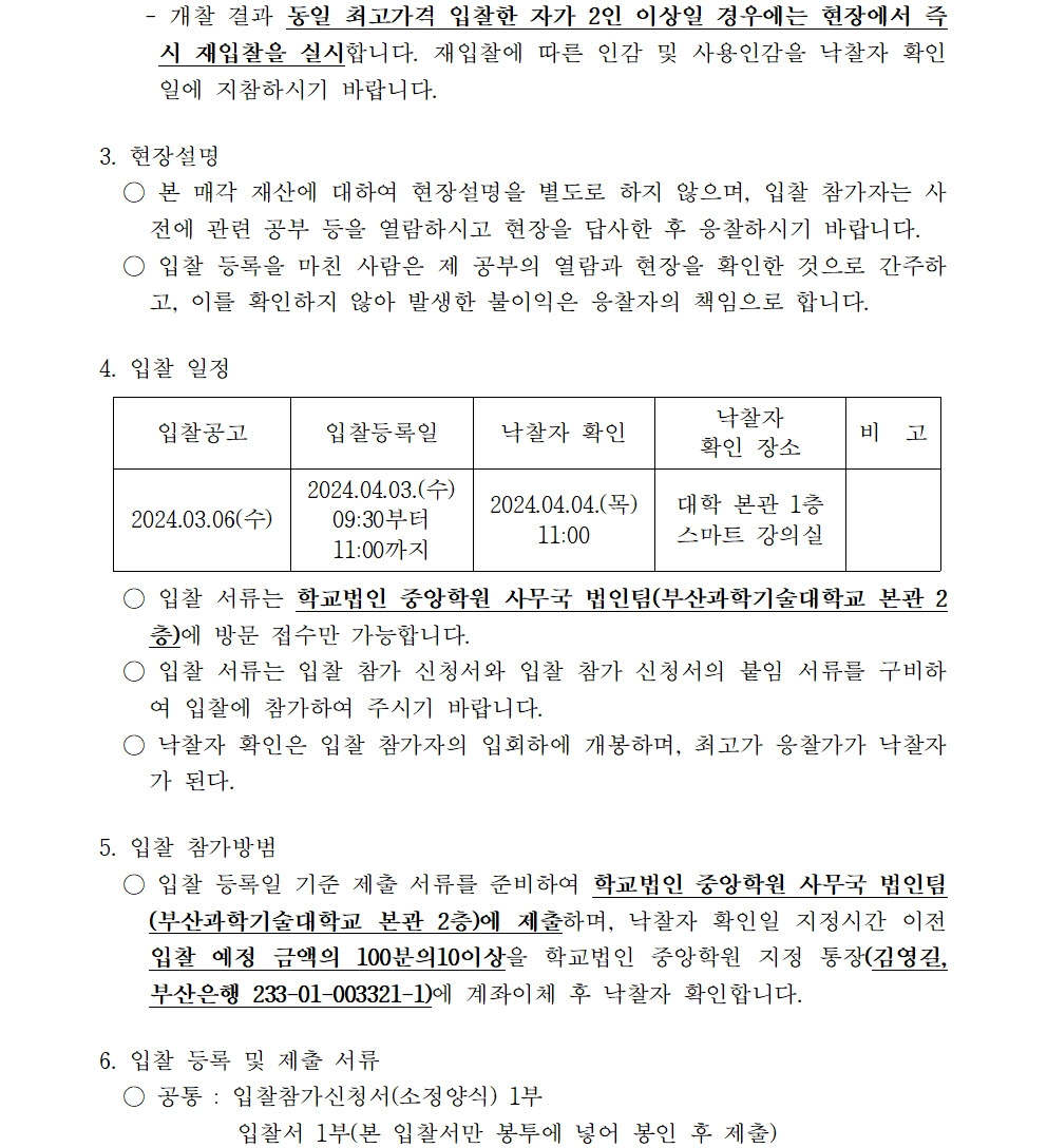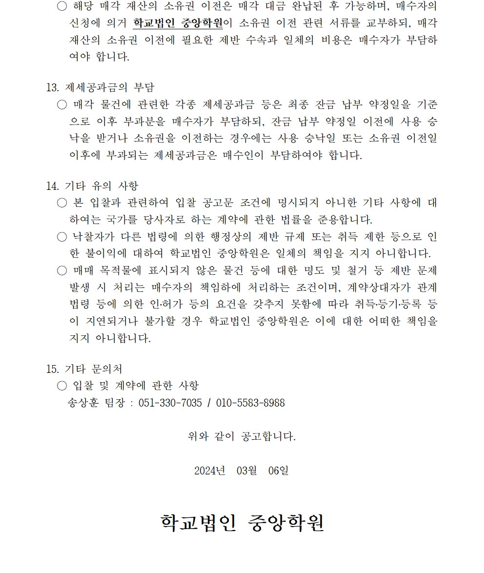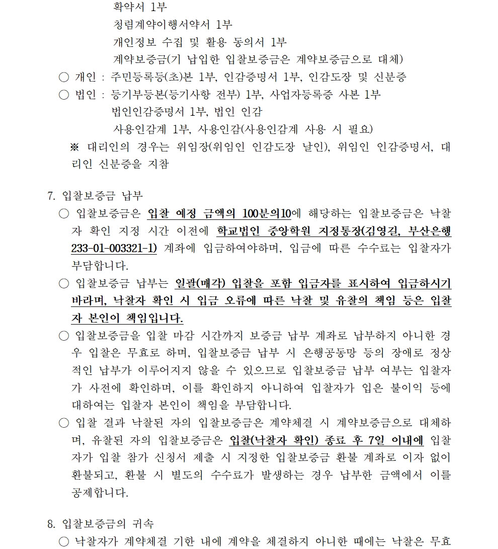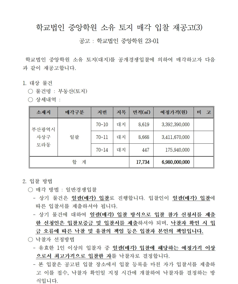HOME > 기타 > 입찰/채용 입찰/채용 제목 [입찰] 학교법인 중앙학원 수익용 기본재산 부동산(토지) 매각 입찰 재공고(3) 등록일 2024.03.06 07:03:27 작성자 행정지원처 첨부파일 붙임9. 입찰참가 서류 양식(23-1, 재공고-3).zip [717.03 KB] 조회 1256 이전글 [채용] 산학협력단 (부산미래형 일자리지원사업) 계약직 직원 채용 다음글 [채용] 부산과학기술대학교 계약직 직원(행정) 채용 공고 목록 비밀글 비밀번호 입력 폼 비밀번호 입력 비밀번호를 입력하여 주세요. 관리자는 확인버튼만 누르시면 됩니다. 비밀번호 잘못된 비밀번호입니다. 비밀번호를 다시 입력해주세요. 확인