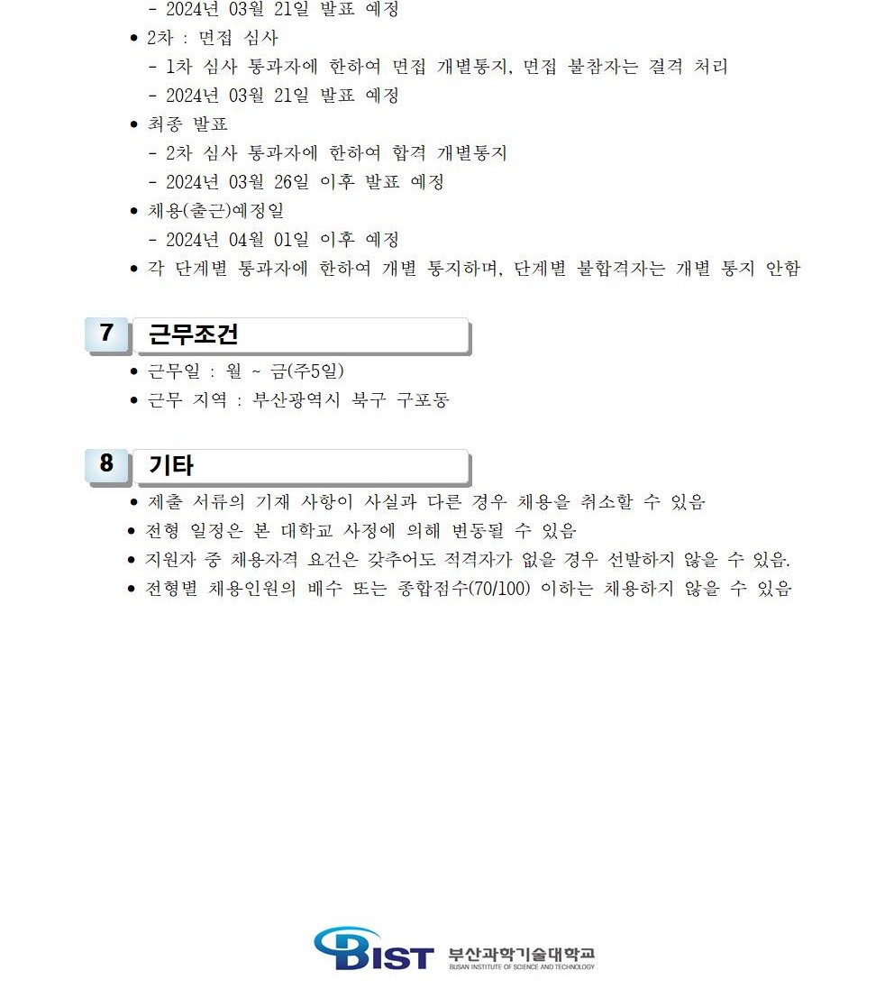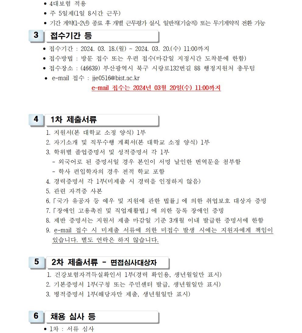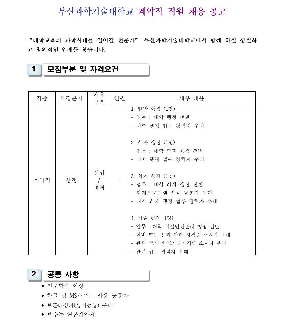 HOME > 기타 > 입찰/채용 입찰/채용 제목 [채용] 부산과학기술대학교 계약직 직원(행정) 채용 공고 등록일 2024.03.06 09:03:12 작성자 행정지원처 첨부파일 1-2. 공고문(행정-계약).pdf [179.22 KB]1-3-3. 직원채용_지원서.hwp [57.50 KB] 조회 1438 이전글 [입찰] 학교법인 중앙학원 수익용 기본재산 부동산(토지) 매각 입찰 재공고(3) 다음글 [입찰]2025학년도 입시홍보물 제작관련 업체선정 입찰공고(긴급) 목록 비밀글 비밀번호 입력 폼 비밀번호 입력 비밀번호를 입력하여 주세요. 관리자는 확인버튼만 누르시면 됩니다. 비밀번호 잘못된 비밀번호입니다. 비밀번호를 다시 입력해주세요. 확인