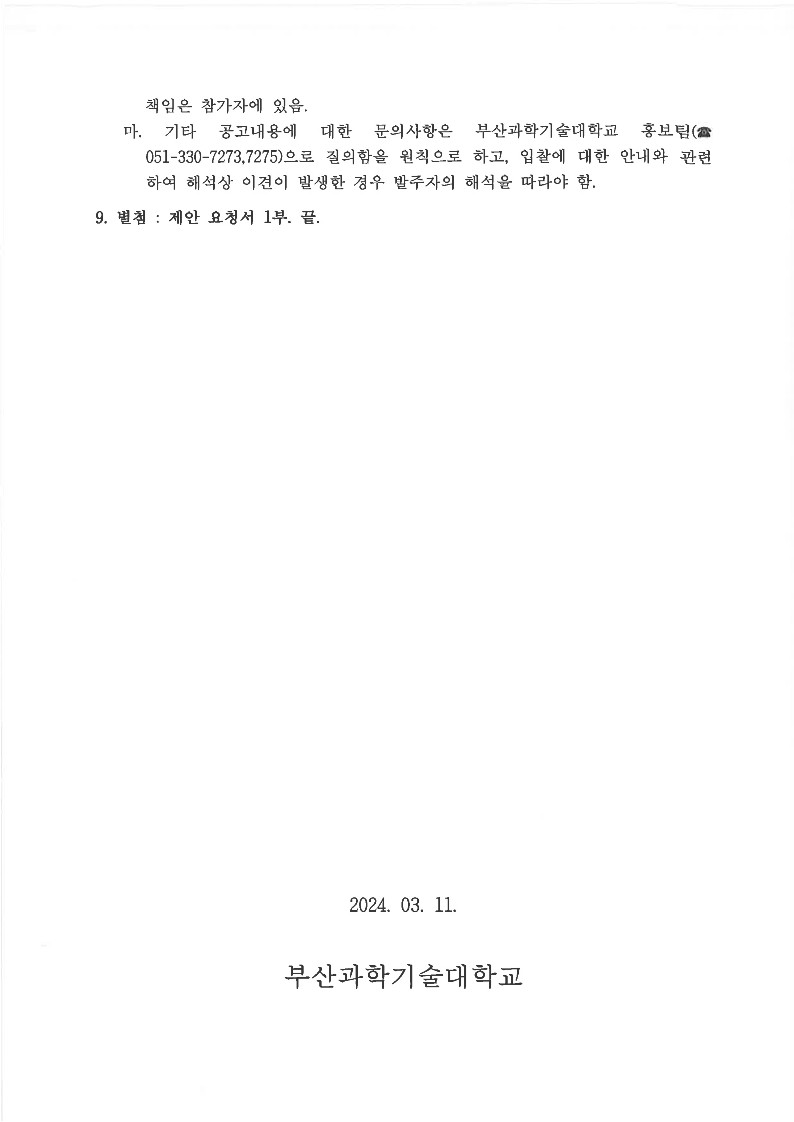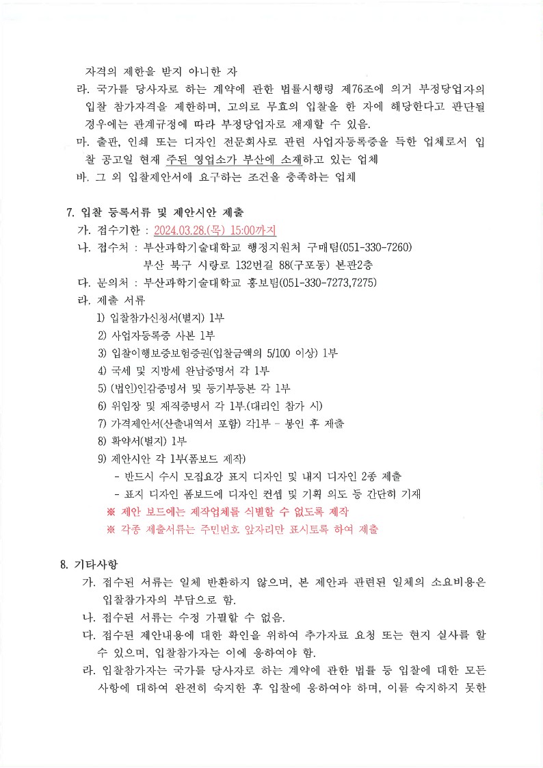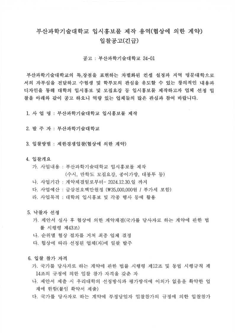 HOME > 기타 > 입찰/채용 입찰/채용 제목 [입찰]2025학년도 입시홍보물 제작관련 업체선정 입찰공고(긴급) 등록일 2024.03.11 17:33:39 작성자 행정지원처 첨부파일 [제안요청서]부산과학기술대학교 입시홍보물 제안요청서.hwp [190.00 KB] 조회 1220 이전글 [채용] 부산과학기술대학교 계약직 직원(행정) 채용 공고 다음글 [채용] 부산과학기술대학교 계약직 직원(사감) 직원 채용 공고 목록 비밀글 비밀번호 입력 폼 비밀번호 입력 비밀번호를 입력하여 주세요. 관리자는 확인버튼만 누르시면 됩니다. 비밀번호 잘못된 비밀번호입니다. 비밀번호를 다시 입력해주세요. 확인