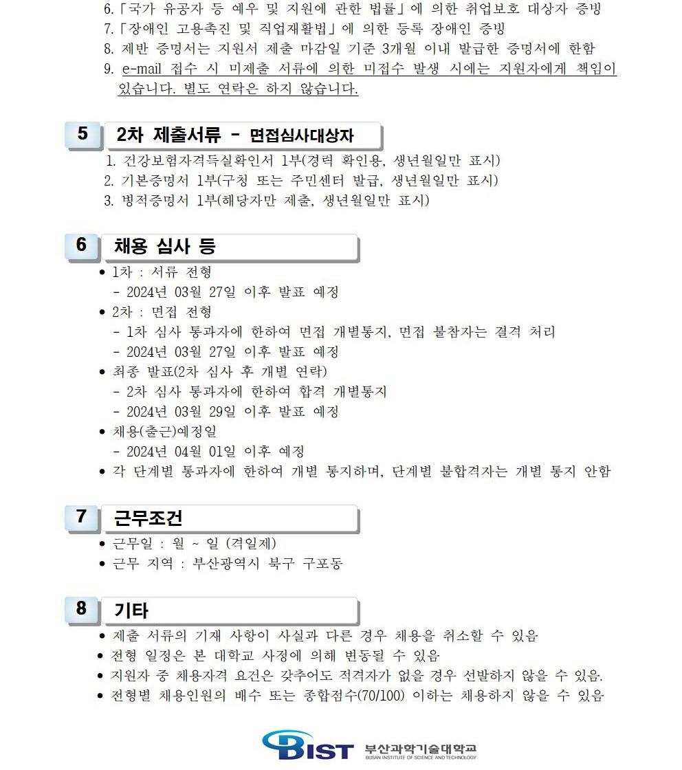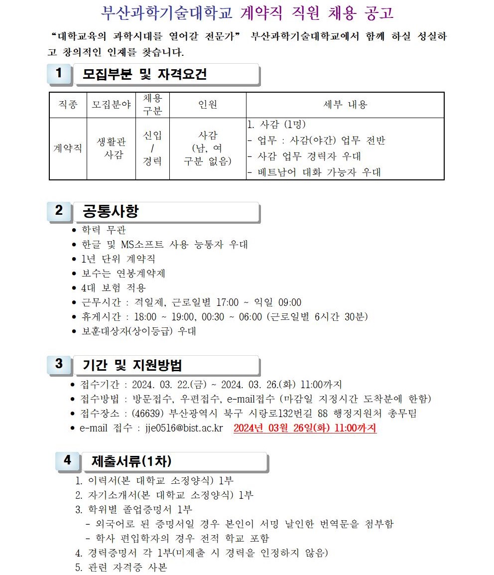HOME > 기타 > 입찰/채용 입찰/채용 제목 [채용] 부산과학기술대학교 계약직 직원(사감) 직원 채용 공고 등록일 2024.03.12 11:03:29 작성자 행정지원처 첨부파일 1-2. 공고문(생활관, 계약직).pdf [177.02 KB]1-3-3. 직원채용_지원서.hwp [45.50 KB] 조회 1562 이전글 [입찰]2025학년도 입시홍보물 제작관련 업체선정 입찰공고(긴급) 다음글 [채용] 부산과학기술대학교 산학협력단(일학습병행사업 등) 계약직 직원 채용 목록 비밀글 비밀번호 입력 폼 비밀번호 입력 비밀번호를 입력하여 주세요. 관리자는 확인버튼만 누르시면 됩니다. 비밀번호 잘못된 비밀번호입니다. 비밀번호를 다시 입력해주세요. 확인