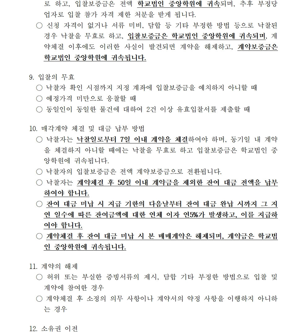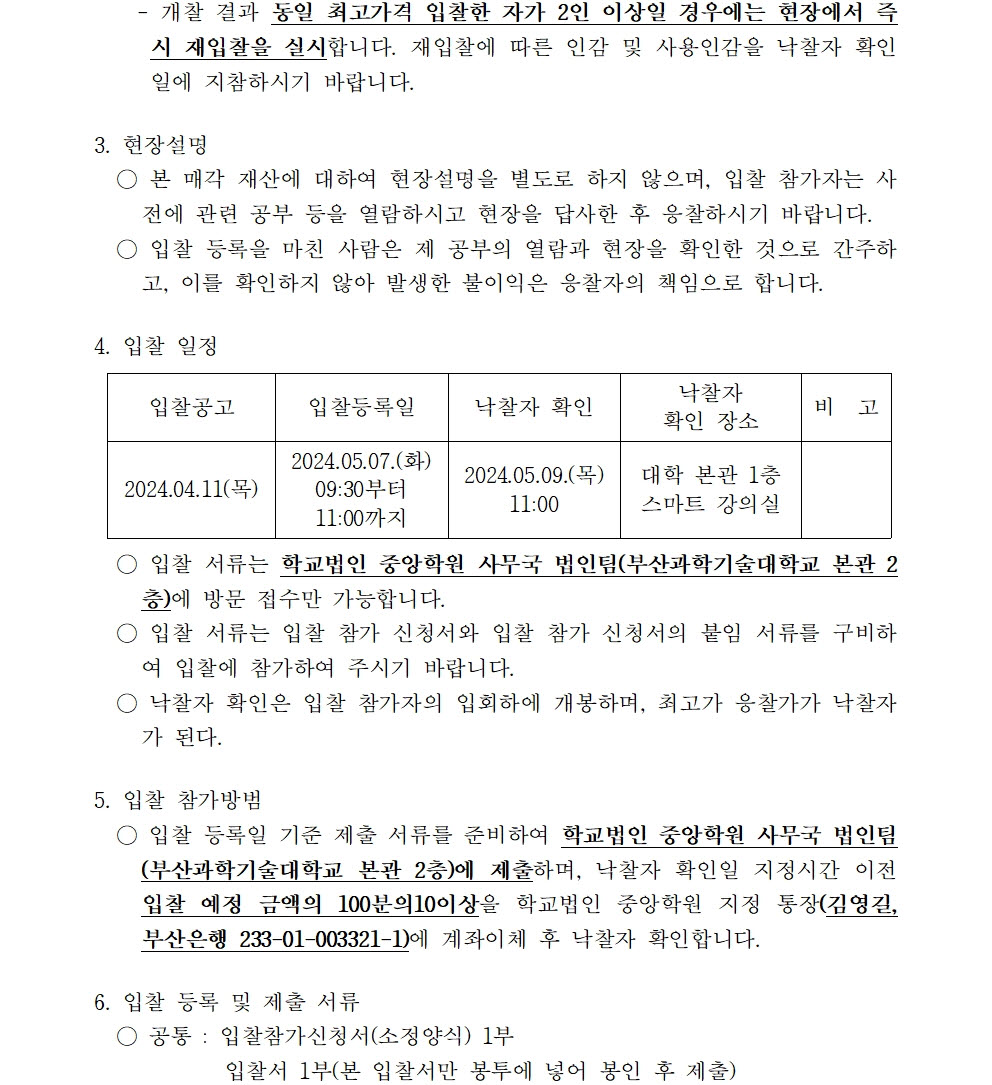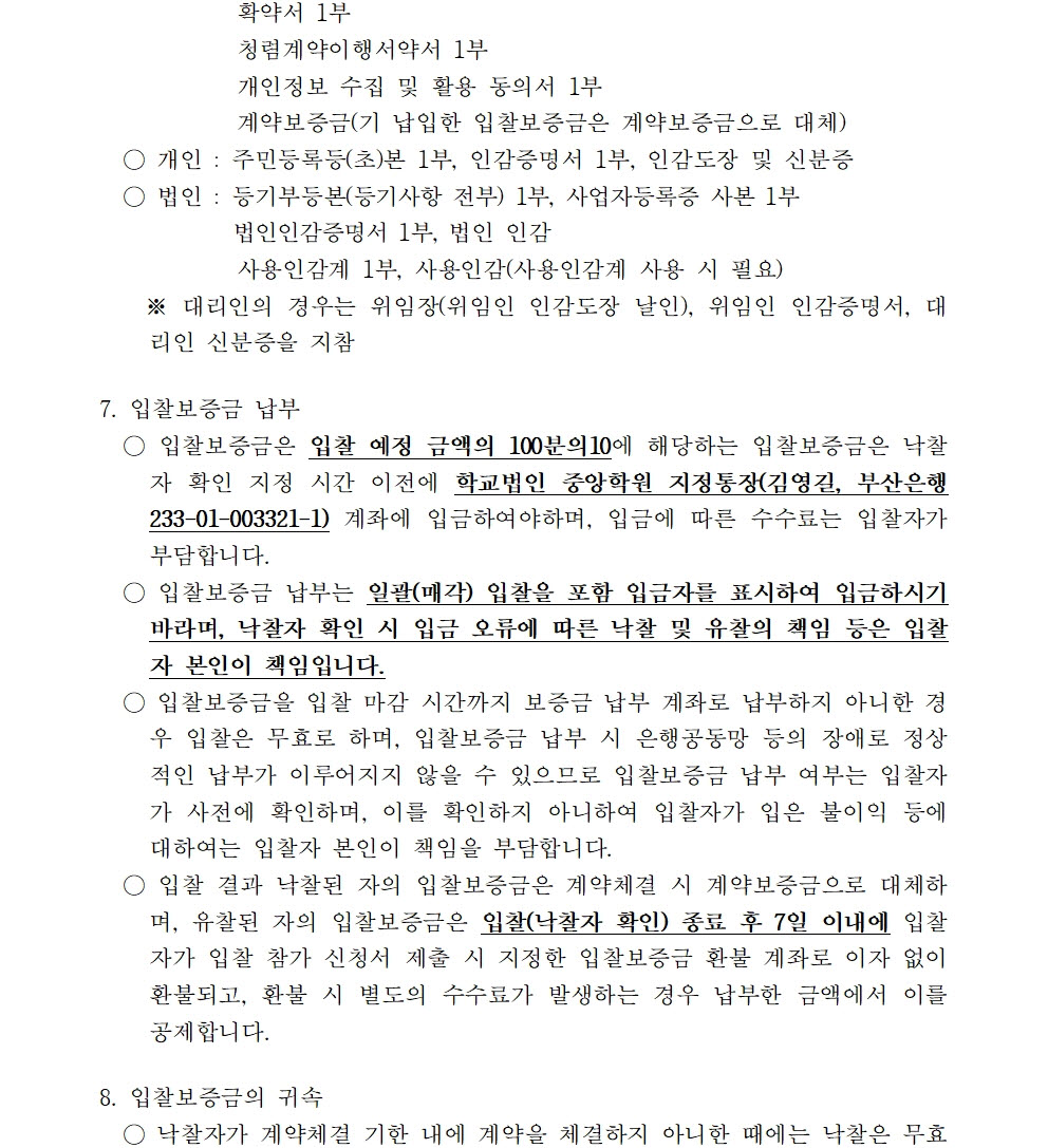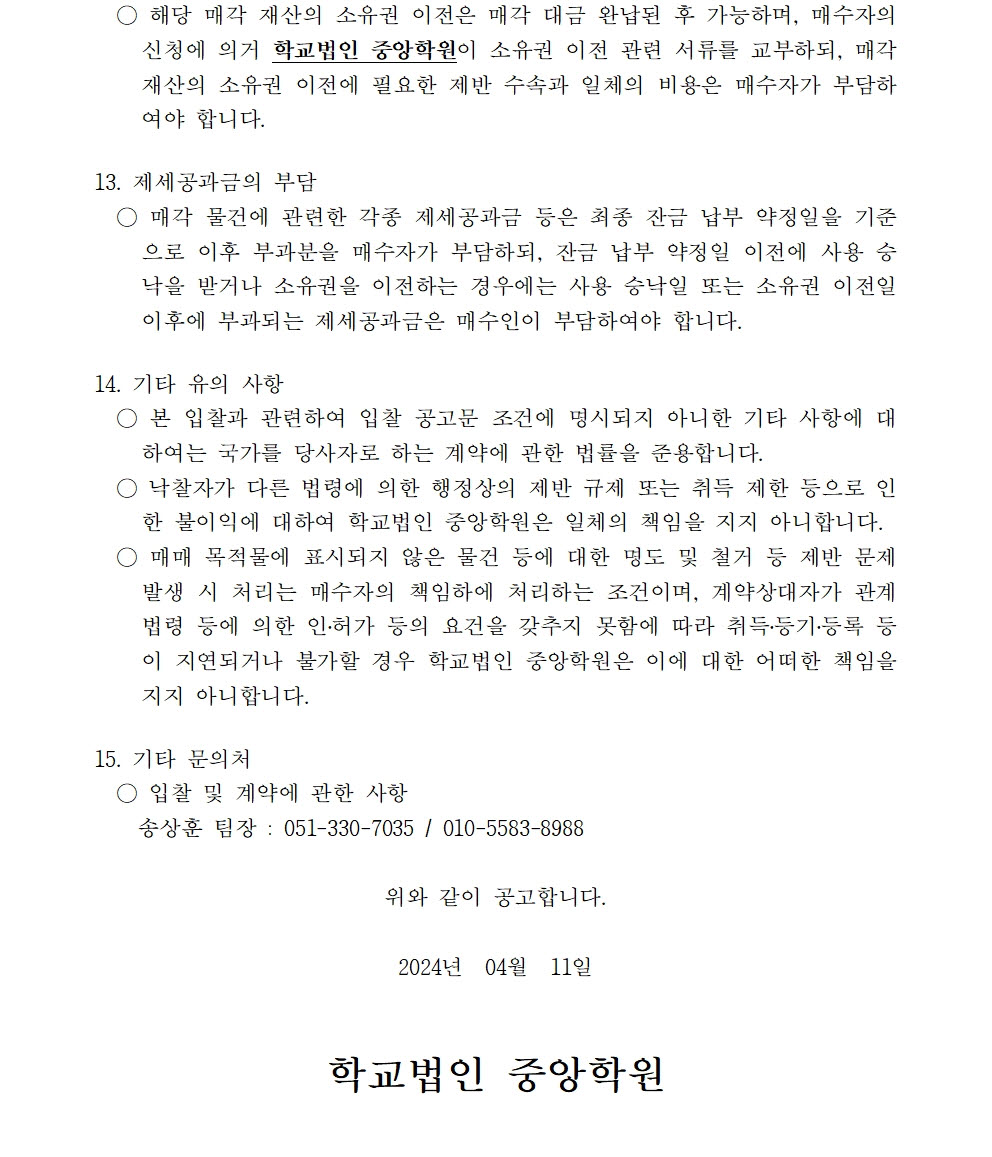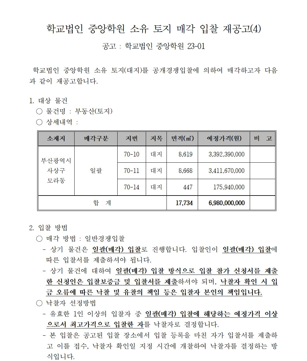 HOME > 기타 > 입찰/채용 입찰/채용 제목 [입찰] 학교법인 중앙학원 수익용 기본재산 부동산(토지) 매각 입찰 재공고(4) 등록일 2024.04.11 09:04:11 작성자 행정지원처 첨부파일 붙임9. 입찰참가 서류 양식(23-1, 재공고-4).zip [715.37 KB] 조회 1150 이전글 [채용] 부산과학기술대학교 산학협력단(일학습병행사업 등) 계약직 직원 채용 다음글 [채용] 부산과학기술대학교 계약직 직원(사감) 직원 채용 공고 목록 비밀글 비밀번호 입력 폼 비밀번호 입력 비밀번호를 입력하여 주세요. 관리자는 확인버튼만 누르시면 됩니다. 비밀번호 잘못된 비밀번호입니다. 비밀번호를 다시 입력해주세요. 확인