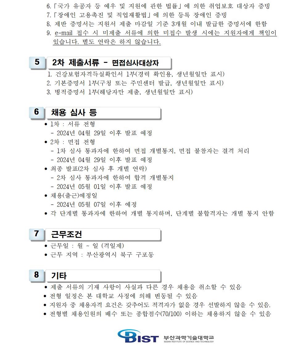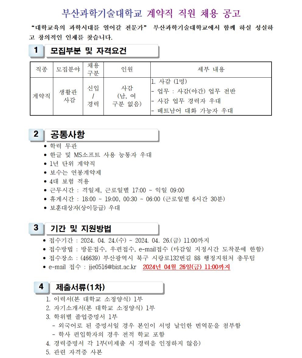 HOME > 기타 > 입찰/채용 입찰/채용 제목 [채용] 부산과학기술대학교 계약직 직원(사감) 직원 채용 공고 등록일 2024.04.12 11:04:09 작성자 행정지원처 첨부파일 1-2. 공고문(생활관, 계약직).pdf [177.01 KB]1-3-3. 직원채용_지원서.hwp [45.50 KB] 조회 1419 이전글 [입찰] 학교법인 중앙학원 수익용 기본재산 부동산(토지) 매각 입찰 재공고(4) 다음글 [채용] 부산과학기술대학교 계약직 직원(행정) 채용 공고 목록 비밀글 비밀번호 입력 폼 비밀번호 입력 비밀번호를 입력하여 주세요. 관리자는 확인버튼만 누르시면 됩니다. 비밀번호 잘못된 비밀번호입니다. 비밀번호를 다시 입력해주세요. 확인