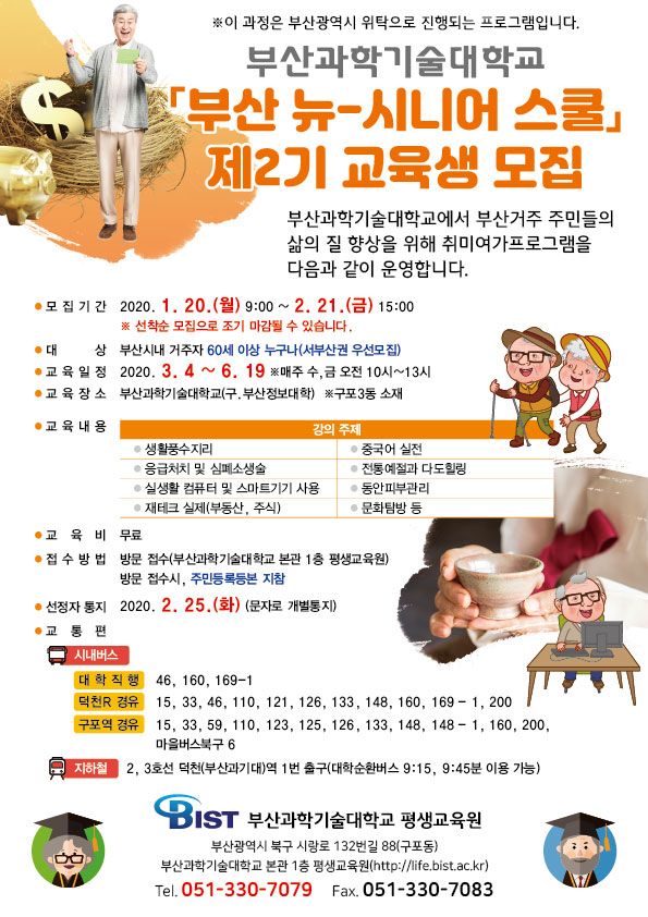 부산과학기술대학교에서 "부산 뉴-시니어 스쿨" 제2기 교육생 모집을 합니다.
