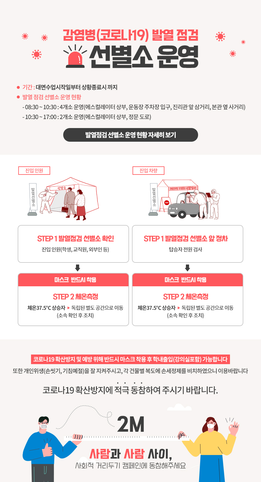 HOME > 기타 > 공지사항 공지사항 제목 대면수업 운영에 따른 감염병(코로나19) 발열 점검 선별소 안내 등록일 2020.05.06 15:05:49 작성자 관리자 첨부파일 조회 8572 이전글 2020 대학 홍보모델 모집공고(지원서 다운로드) 다음글 2020학년도 학습 튜터링/스터디 모집 안내 목록 비밀글 비밀번호 입력 폼 비밀번호 입력 비밀번호를 입력하여 주세요. 관리자는 확인버튼만 누르시면 됩니다. 비밀번호 잘못된 비밀번호입니다. 비밀번호를 다시 입력해주세요. 확인